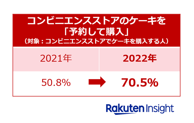 ケーキを予約購入するかについて聞いたところ、「コンビニエンスストアのオリジナルケーキ」では「予約して購入する」が70.5%となり、昨年(50.8%)から約20ポイント増加した。一方、「百貨店のオリジナルケーキ」を購入する人のうち「予約して購入する」人の割合(54.5%)は、昨年(65.3%)と比べて10ポイント以上低い結果となった。