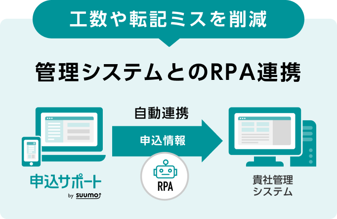 『申込サポート by SUUMO』で取得した申込情報を自社の管理システムへ自動入力できるようになるRPAをご提供します。従来は自社の管理システムへはシステムへの手入力が必要でした。RPAを用いた申込情報の自動連携をすることにより、手入力の必要がなくなり、業務工数や転記ミスを削減することができます。