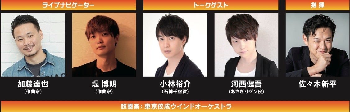 さらに加藤達也、堤博明がナビゲーターとして楽曲解説を行い、観客を『Dr.STONE』の世界により深く誘います。また、『Dr.STONE』キャストの、小林裕介(石神千空役)、河西健吾(あさぎりゲン役)の登壇も決定!