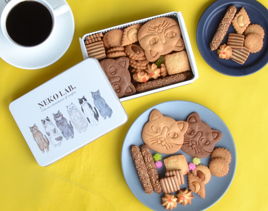 猫好きによる、猫好きのための菓子・グッズを生み出すブランド「NEKO LAB」。猫顔のクッキーはオリジナルの型で焼きあげています。個性豊かな6匹の猫が描かれた缶です。★初登場