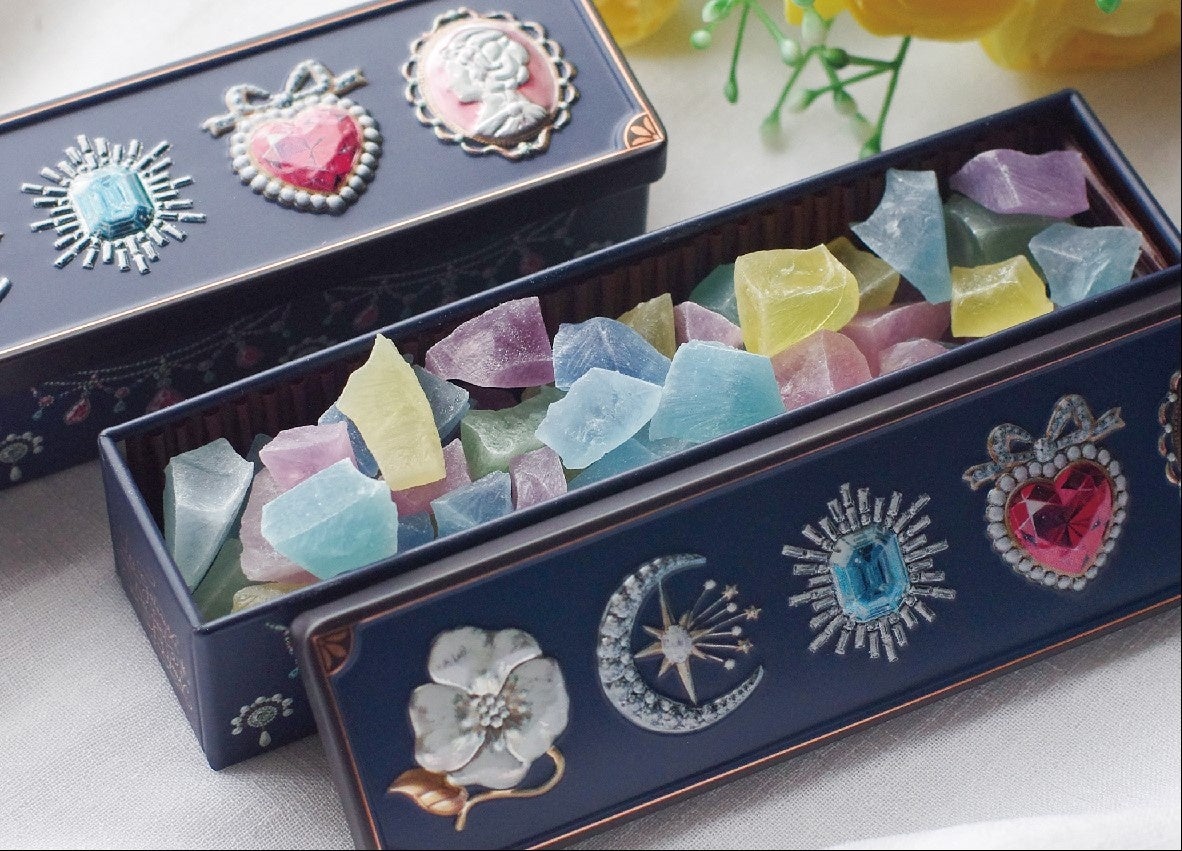 宝石のような見た目とシャリっとした程よい食感に仕上げるため、一部商品を除いて包丁や型を使わず手で成形しています。宝石がちりばめられたビジュー缶パッケージ。 ★初登場