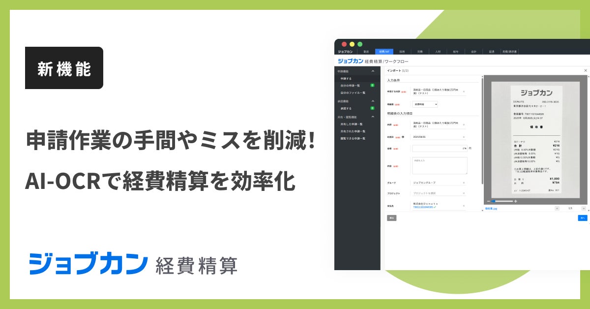 株式会社DONUTS(東京都渋谷区、代表取締役:西村啓成)が提供するクラウド型経費精算システム『ジョブカン経費精算』は、領収書の画像データから経費精算申請に必要な情報の自動読み取りが可能となる「AI-OCR機能」のオプション提供を開始しました。これにより入力作業・確認にかかる手間やミスを削減し、経理業務の効率化・精度向上を実現します。