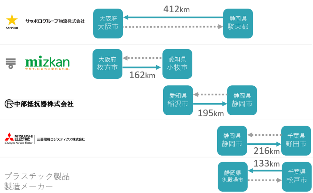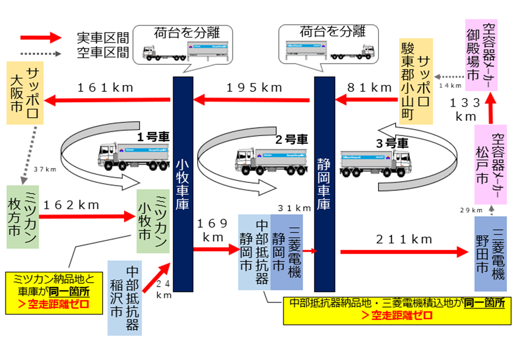 本取り組みは、業界を超えた荷主5社の貨物を、運送事業者である鈴与の荷台と車体の切り離しが可能なスワップボディ車を活用して、千葉~大阪の中間地点に位置する静岡県静岡市・愛知県小牧市の2拠点で中継輸送を行うことで、長距離輸送を無くしました。この共同連携輸送により、輸送車両台数の削減や実車率の向上、作業時間および待機時間の削減を図り、環境負荷の低減に加え、ドライバーの労働環境改善を同時に実現しました。