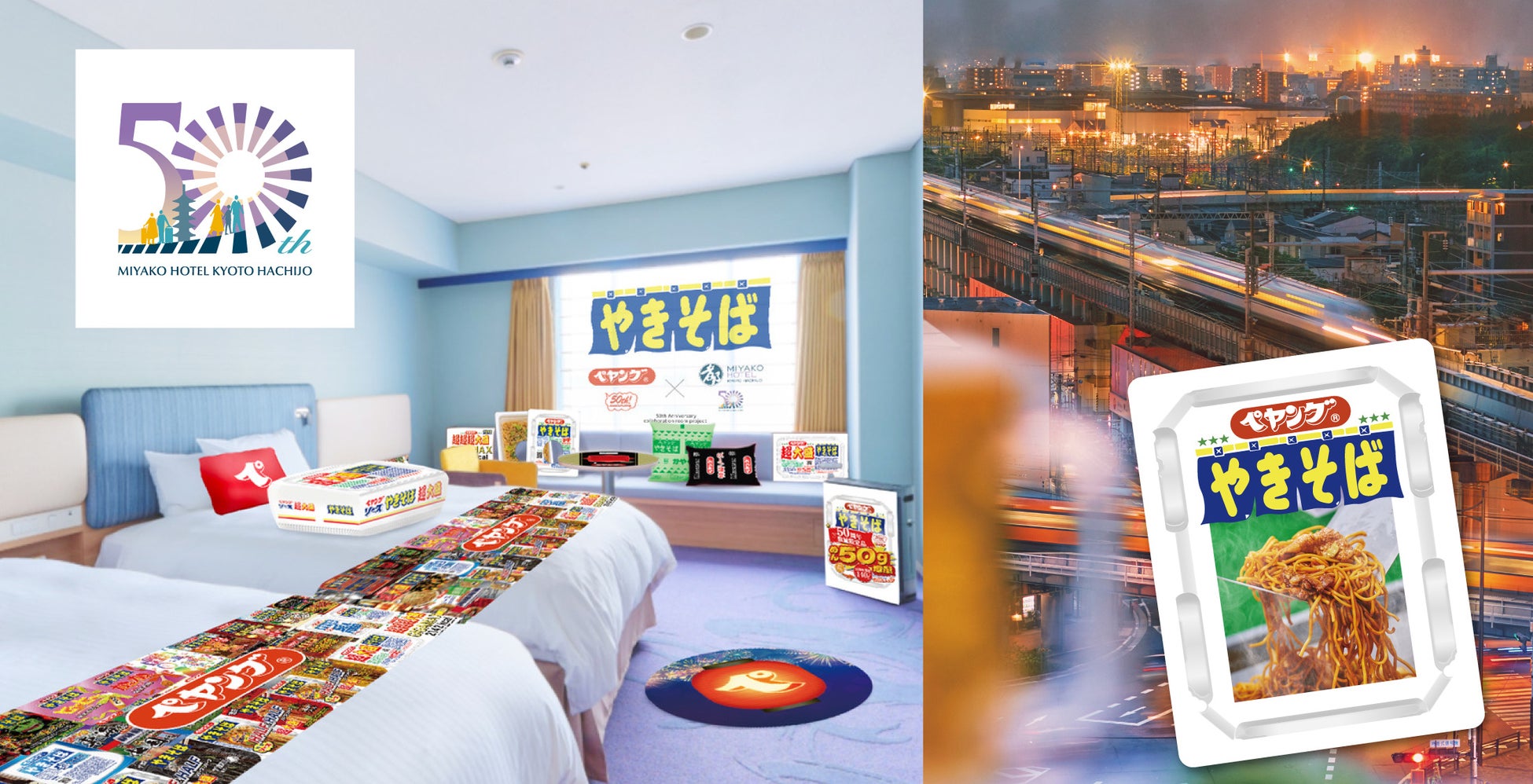 2025年3月に開業50周年を迎えた都ホテル 京都八条(所在地:京都市南区西九条院町17)は、同じく販売50周年を迎えた「ペヤングソースやきそば」とのコラボルームを販売します。また、ペヤングのソースを使用した焼きそばを屋上「スカイビアガーデン」にて提供します。