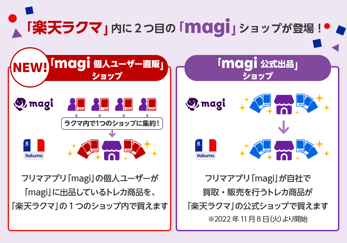 楽天グループ株式会社(以下「楽天」)が運営するフリマアプリ「楽天ラクマ」は、コレクター向けフリマアプリ「magi(マギ)」を運営する株式会社ジラフ(以下「ジラフ」)と連携し、「magi」に出品しているユーザーの「トレーディングカード」商品を「楽天ラクマ」内で一つのショップに集約し、本日より販売を開始しました。