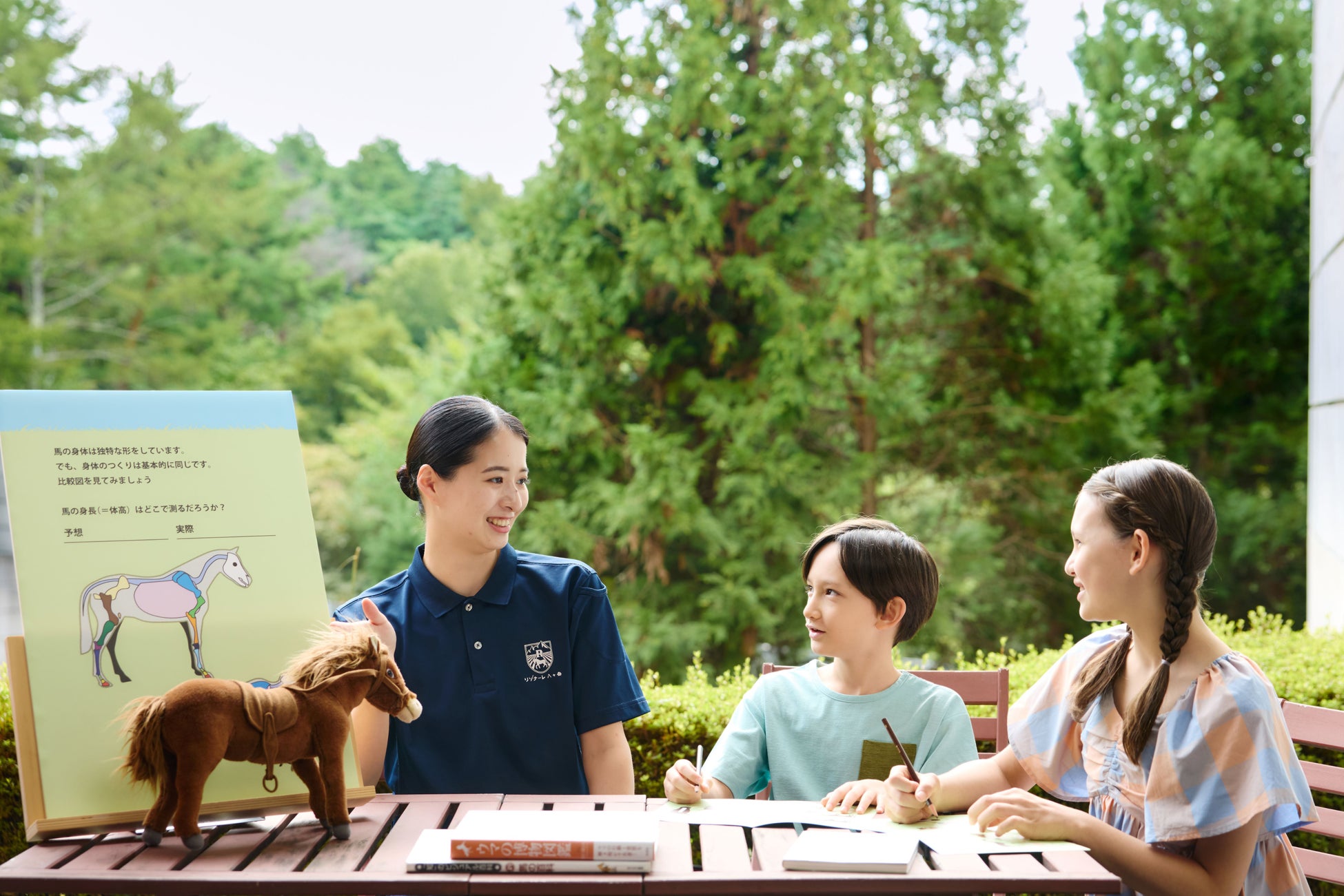 ホテル到着後は、ホテルスタッフと一緒に馬の生態について事前学習を行います。自分や周りの人を思い浮かべながら、人間と馬の身体のつくりや感情表現、生活リズムにどんな違いがあるのかを予想。自分なりの考えを持ってステップ2へつなげることで、より意欲的に自由研究に取り組み、学びを深められます。