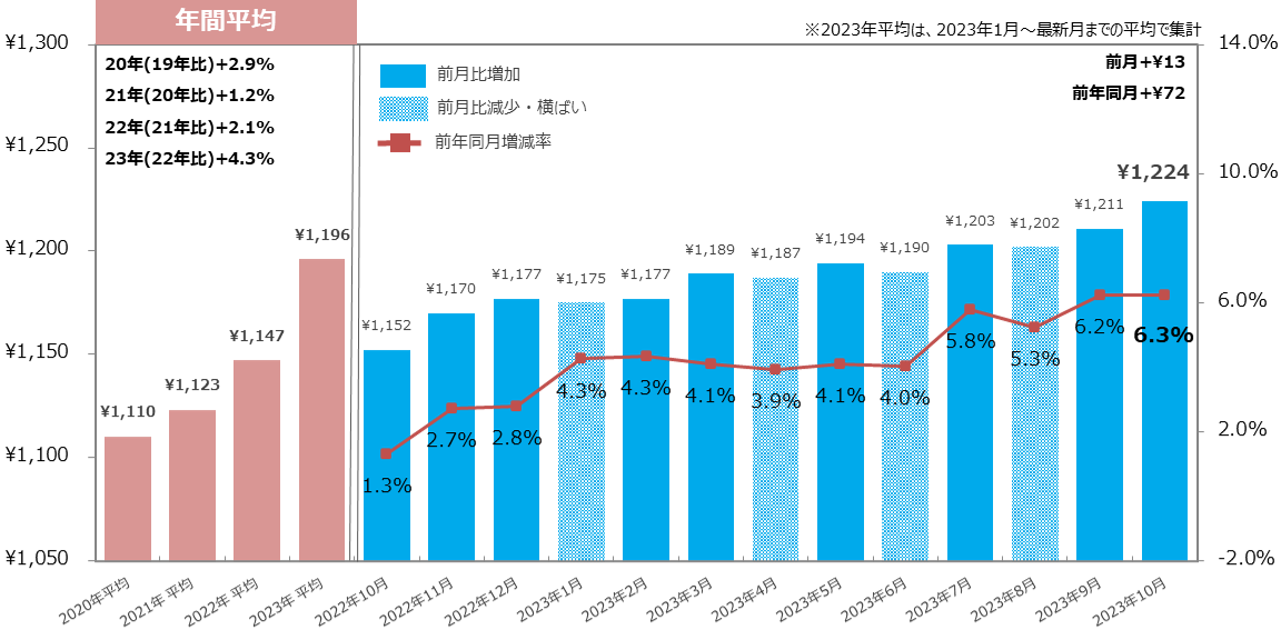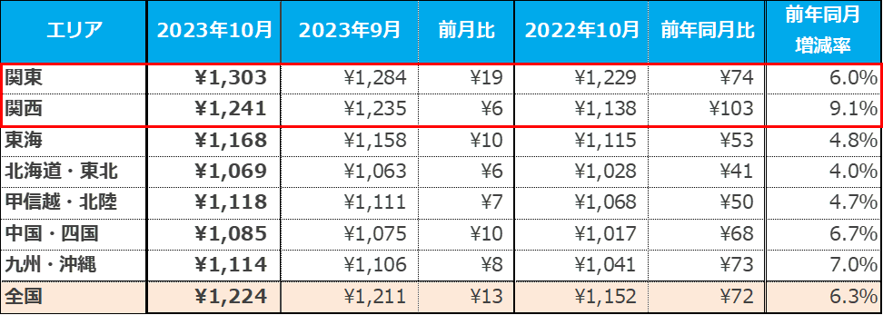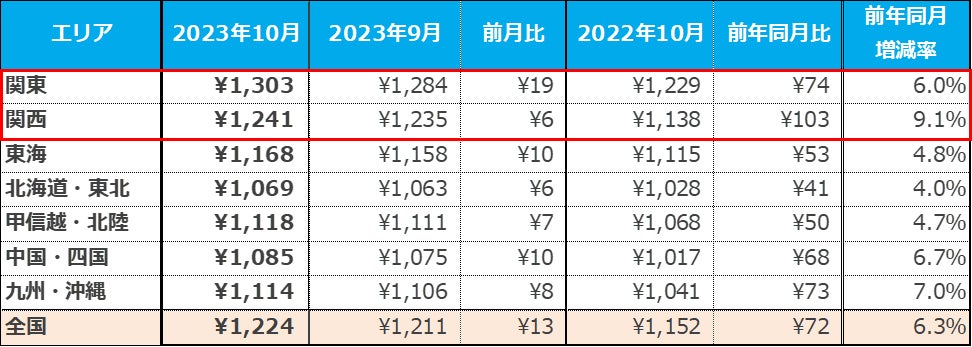 「関東」は1,303円で前月比19円の増加、前年同月比74円の増加(増減率:+6.0%)となり、2020年1月の調査開始以来はじめて1,300円を超え過去最高額を更新。
