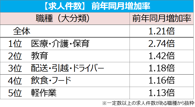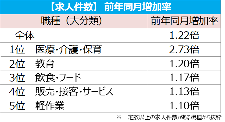 また、[医療・介護・保育]は、1,510円(前月比:+12円、前年同月比:+153円)で、調査開始以来はじめて1,500円台となり、求人件数は前年同月比で約2.7倍に増加した。
