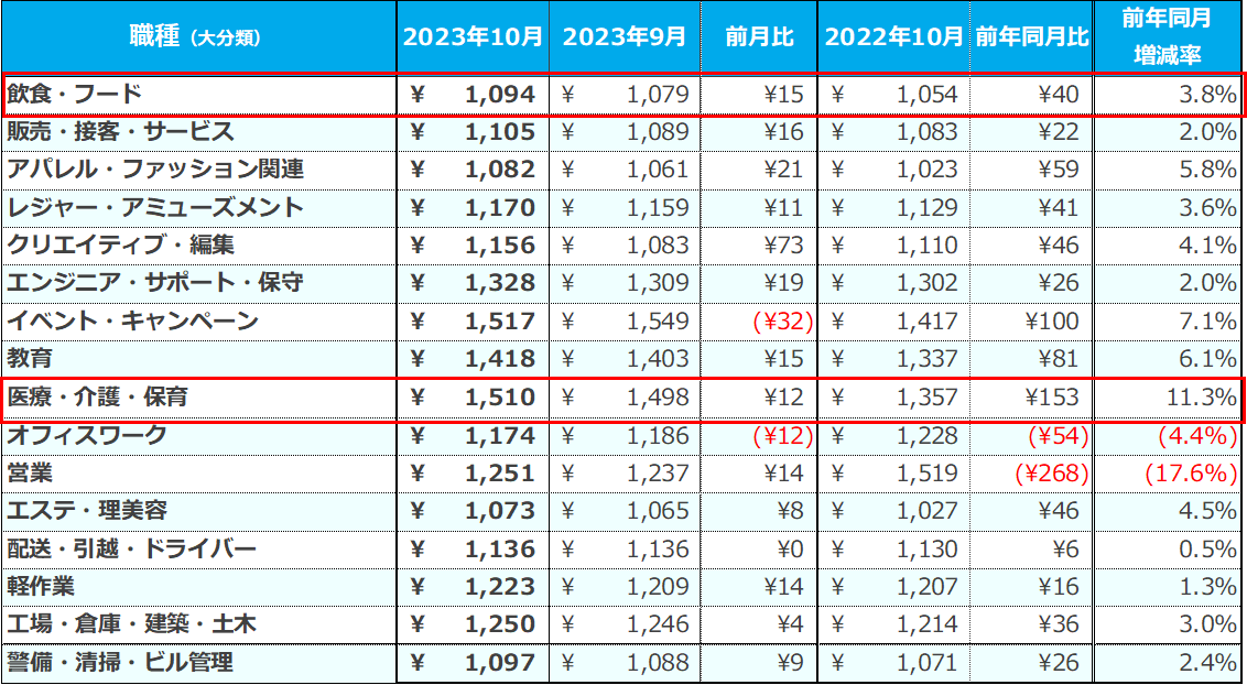 最低賃金改定後初の調査ということもあり、多くの職種で時給が上がっていることがわかる。