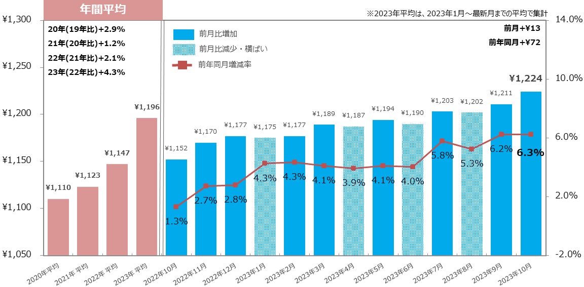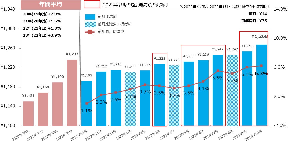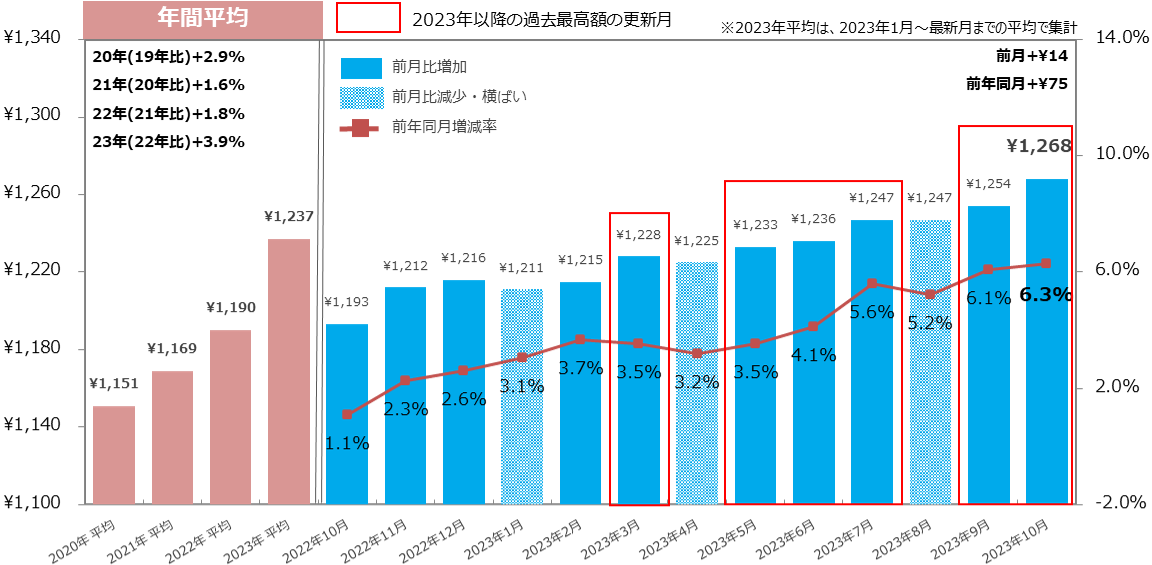 また、「関西」は1,241円で前月比6円の増加、前年同月比103円の増加(増減率:+9.0%)となり、2カ月連続で過去最高額を更新した。 【図4】