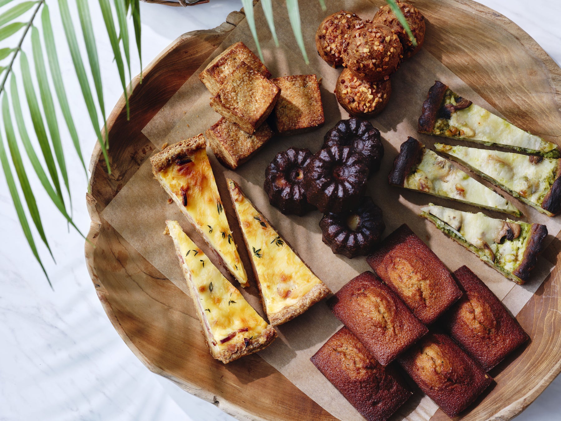 “カヌレ“、”シューパリジャン“、”季節のフルーツのガレット“、”フィナンシェレーヌ“、”スコーン“、”キッシュロレーヌ“、”チキンジェノベーゼのブリオッシュタルト”