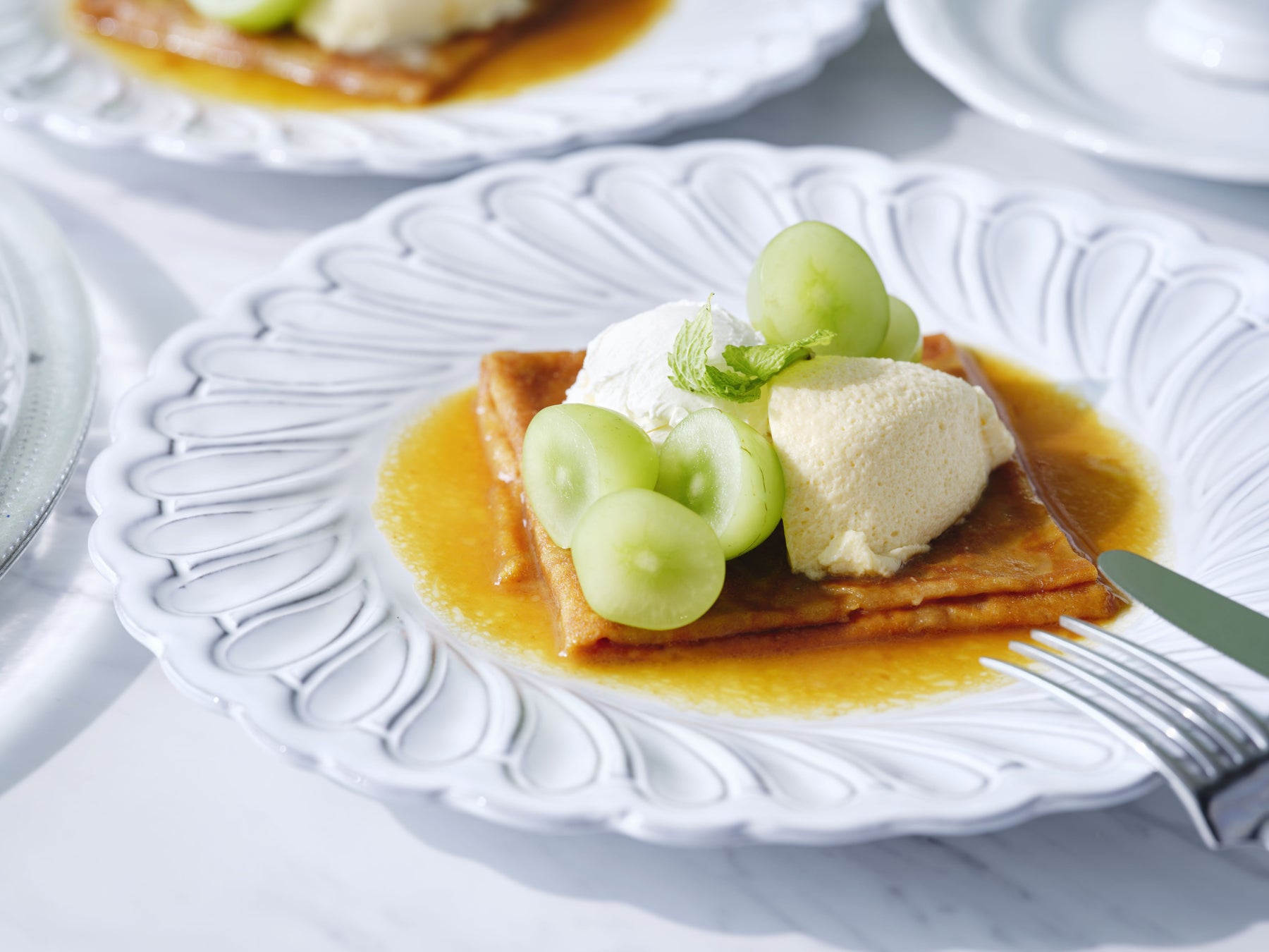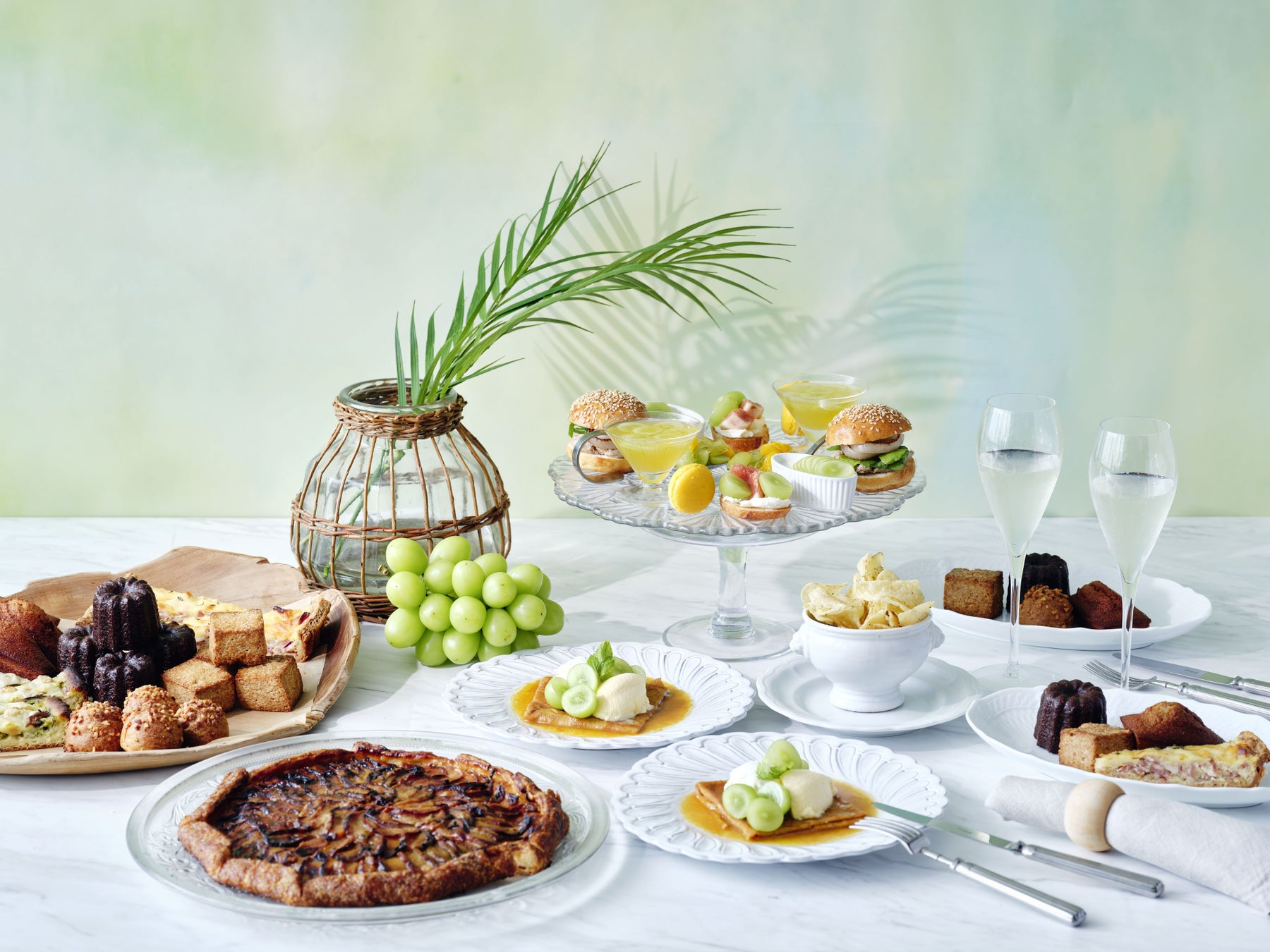『シャインマスカットのアフタヌーンティー』は、Seasonal Premier Plate/プルミエプレート(季節の一皿)に、マスカルポーネの上にシャインマスカットと無花果(イチジク)も盛り付けてはちみつをかけた“シャインマスカットと無花果のカナッペ”、“鴨コンフィバーガー”、シャインマスカットとレモンミントの豊かな香りが楽しめる“シャインマスカットとレモンミントのglassスープ”、シャインマスカットと季節のフルーツの“シャインマスカットのゼリー”、シャインマスカットを盛り付けた濃厚な味わいの“シャインマスカットのブランマンジェ”、“シトロンマカロン”をご用意。お客様の目の前までお運びするBake Wagon/ベイクワゴンは、“カヌレ“、”シューパリジャン“、ネクタリンを甘酸っぱくマリネしガレットに焼き上げた”季節のフルーツのガレット“、”フィナンシェレーヌ“、”スコーン“、”キッシュロレーヌ“、”チキンジェノベーゼのブリオッシュタルト”の全 7 種類の中からお好みの焼菓子(キッシュ含む)を 4 種類その場でお選びいただけます。Main Dessert/メインデザートは、全粒粉をたっぷり使用したクレープを無花果のソースで煮込んだシュゼットにフレッシュなシャインマスカットとチーズババロアが軽い味わいの“シャインマスカットと無花果のシュゼット”をご用意しました。更に、お口直しに白のライオンカップに盛り付けた“ポテトチップス“をご用意。