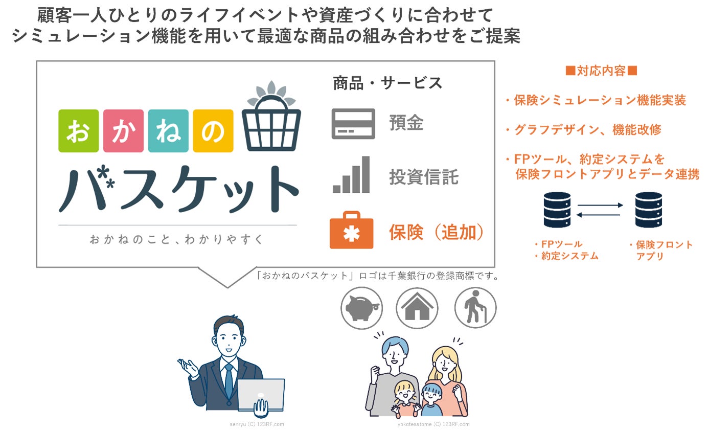 今回インテックはこれらの実績から、千葉銀行が目指す構想の実現に向けた支援が可能であると評価され、「おかねのバスケット」に保険シミュレーション機能を実装しました。