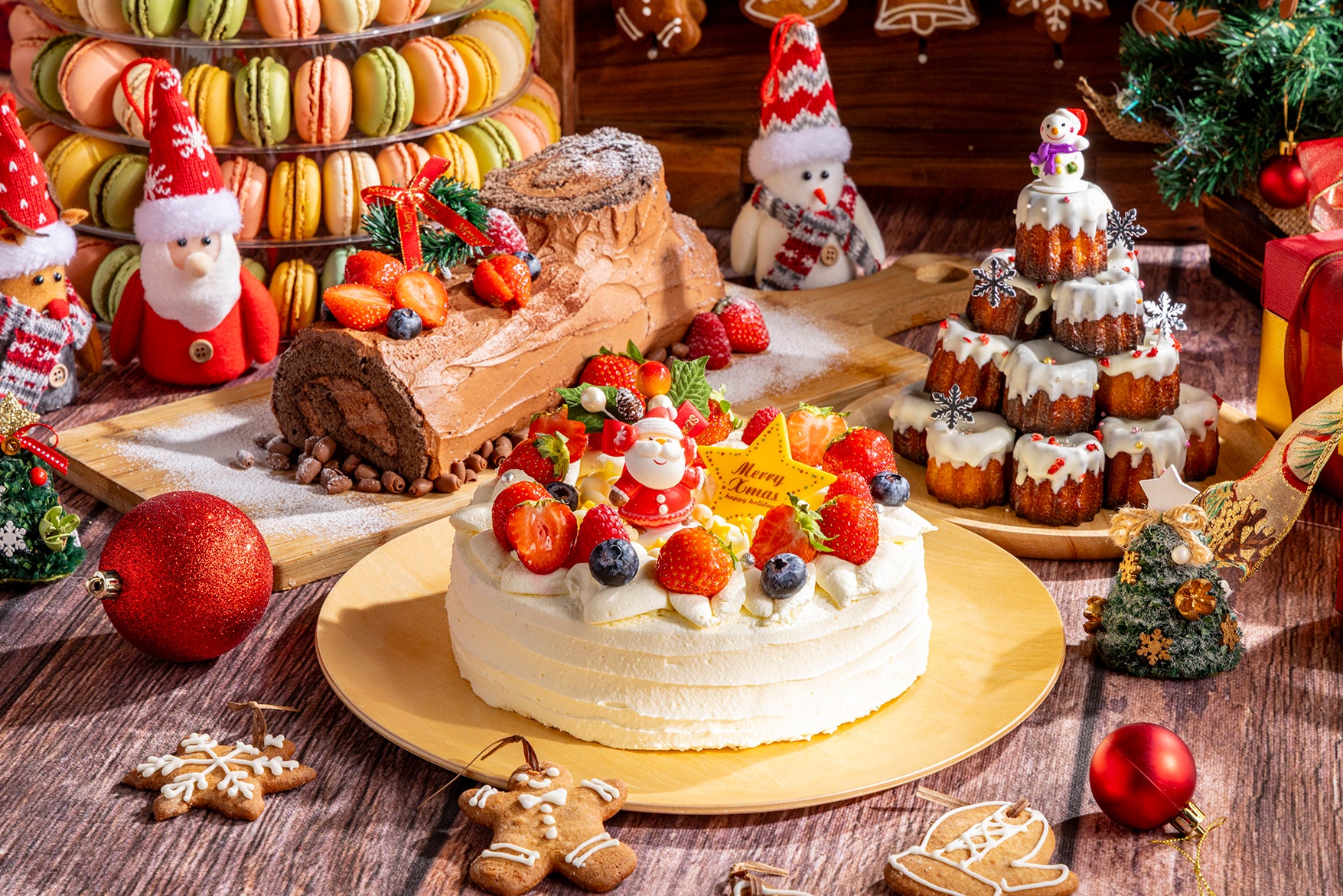 クリスマスショートケーキ 、ブッシュ・ド・ノエル、シュトーレン、クリスマスカヌレ、マカロンタワー、ベリーのゼリー、チョコレートバスクチーズケーキ、みかんのタルト、抹茶のヴェリーヌ、ジンジャーブレッドマンクッキー、ティラミス、フルーツ盛り合わせ、アイスクリーム ほか