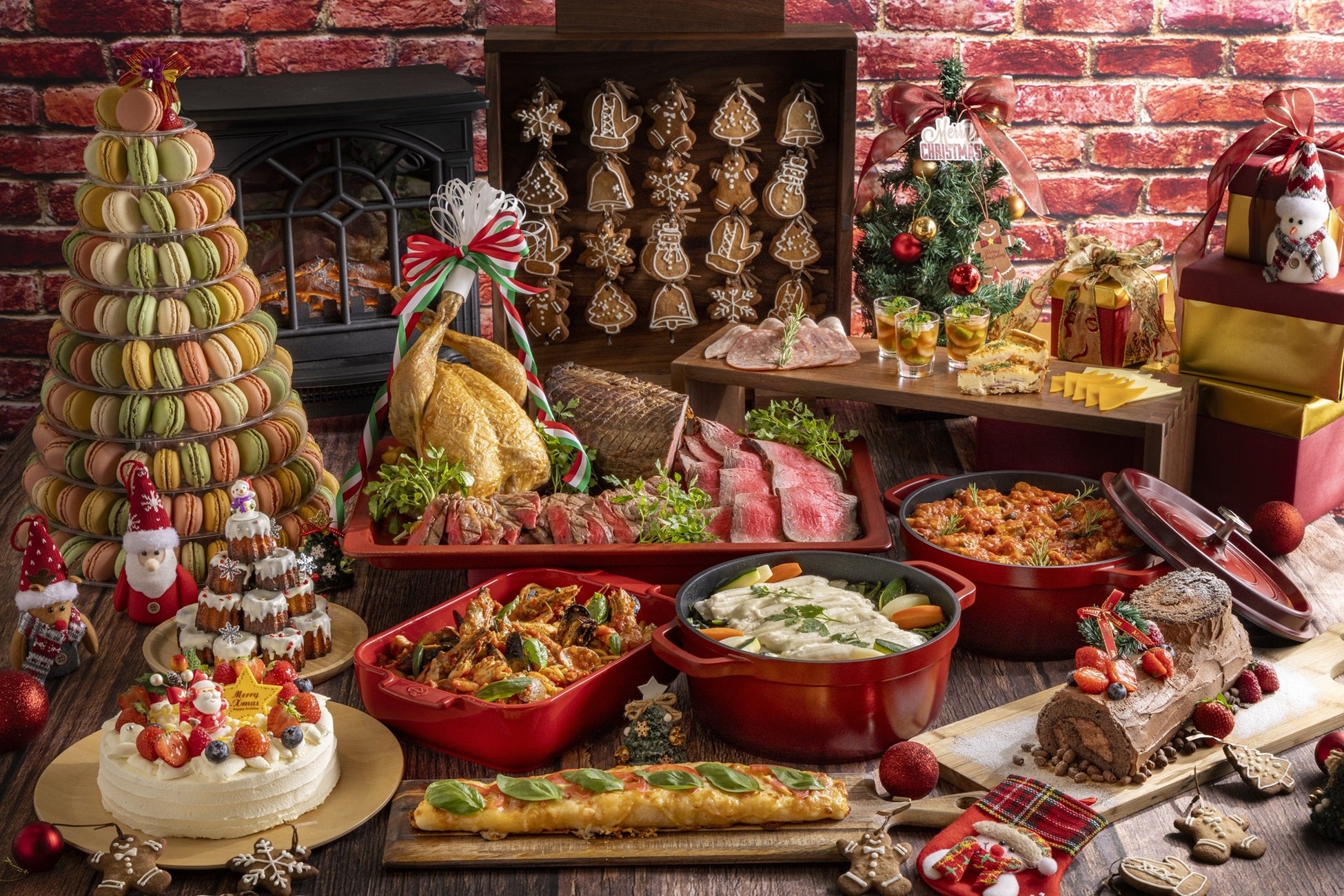 デザートコーナーでは、王道の「クリスマスショートケーキ」や、フランスの伝統的なケーキ「ブッシュ・ド・ノエル」が、クリスマスムードを一層盛り上げます。 ドイツのパン菓子「シュトーレン」や、見た目も楽しい「マカロンタワー」など、テーブルを彩る特別なデザートも勢揃いです。 一枚一枚に絵が描かれた可愛らしい「ジンジャーブレッドマンクッキー」は、お子さまの笑顔を誘います。