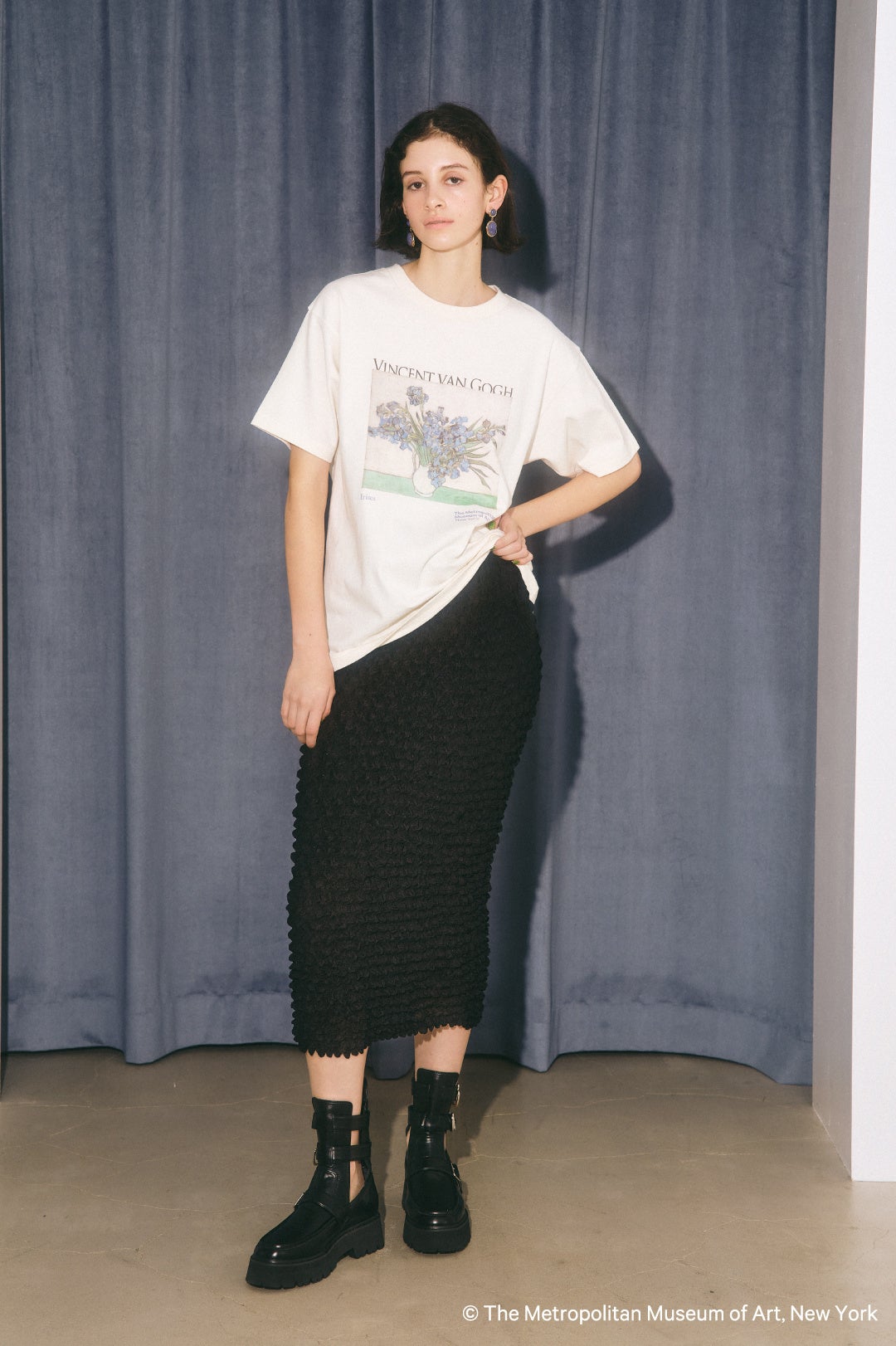 第二弾となるコラボレーションコレクションは、「THE MET」ロゴのワンポイントが目を惹くクロップド丈Tシャツ、所蔵されている絵画を全面プリントしたシア―トップスやワンピース、コーデのアクントになるバッグやソックスなど、計7アイテムの豪華ラインアップでお届けします。