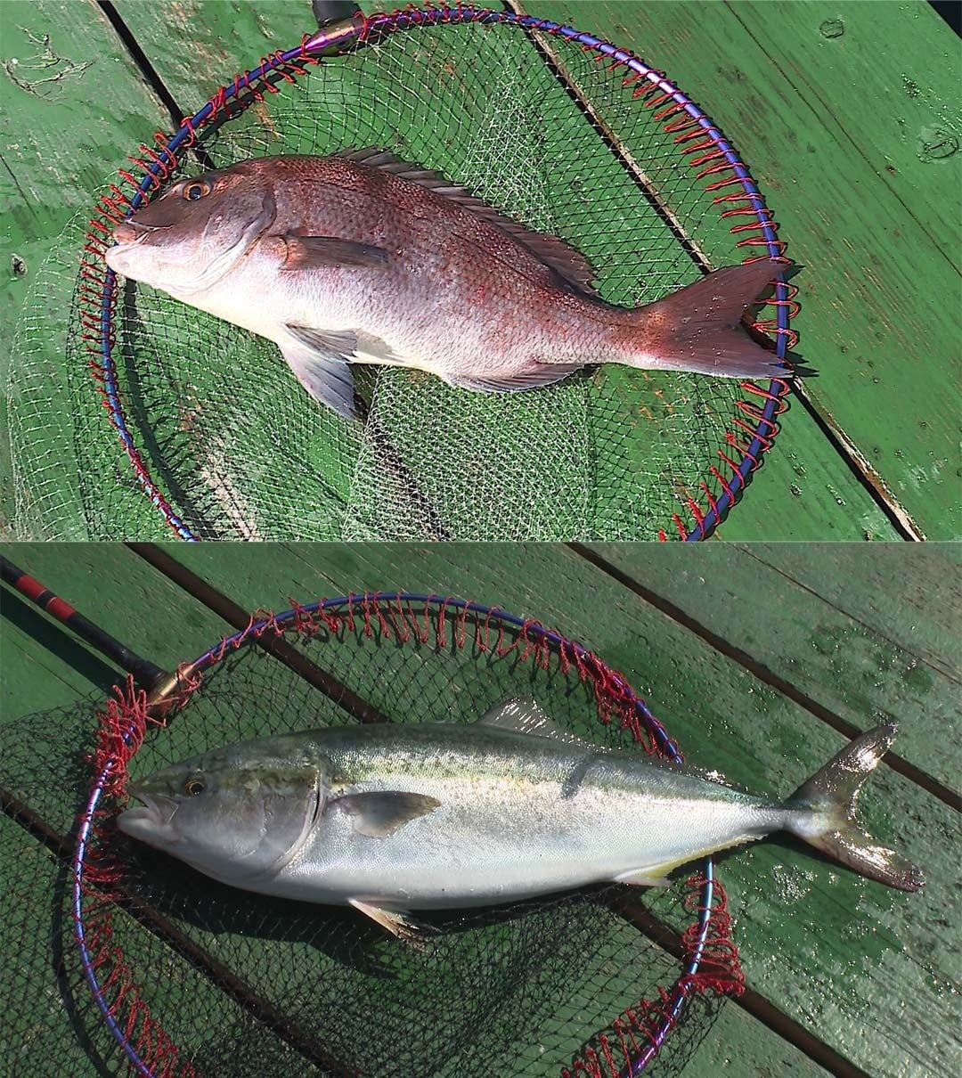 海上釣り堀はイケスに放流された魚を釣るので、まずは釣行する釣り堀で現在、何が放流されているのかを知ることから始まります。今回訪れたフィッシングランド日向ではマダイ、メジロ、ブリ、ハマチ、カンパチ、シマアジをメインにヒラマサやイシダイ、イシガキダイ、スズキ、クロソイなど多彩な魚種が狙えます。マダイは言わずと知れた魚の王様。雑食でダンゴやエビ、鶏のササミの他、切り身でも釣れる不動のメインターゲット。青物と呼ばれるメジロやカンパチはフィッシュイーターの回遊魚。生きた小魚を好んで食べるため生きアジやウグイなどの他、冷凍の小魚なども使います。掛かればイケスの中を走り回る強烈な引きが魅力。シマアジも高級魚で脂が乗った白身が特徴。他の魚に比べて浅いタナを泳ぎ回るので、食い気が出ると姿が見え、釣りのタイミングが計りやすくなります。