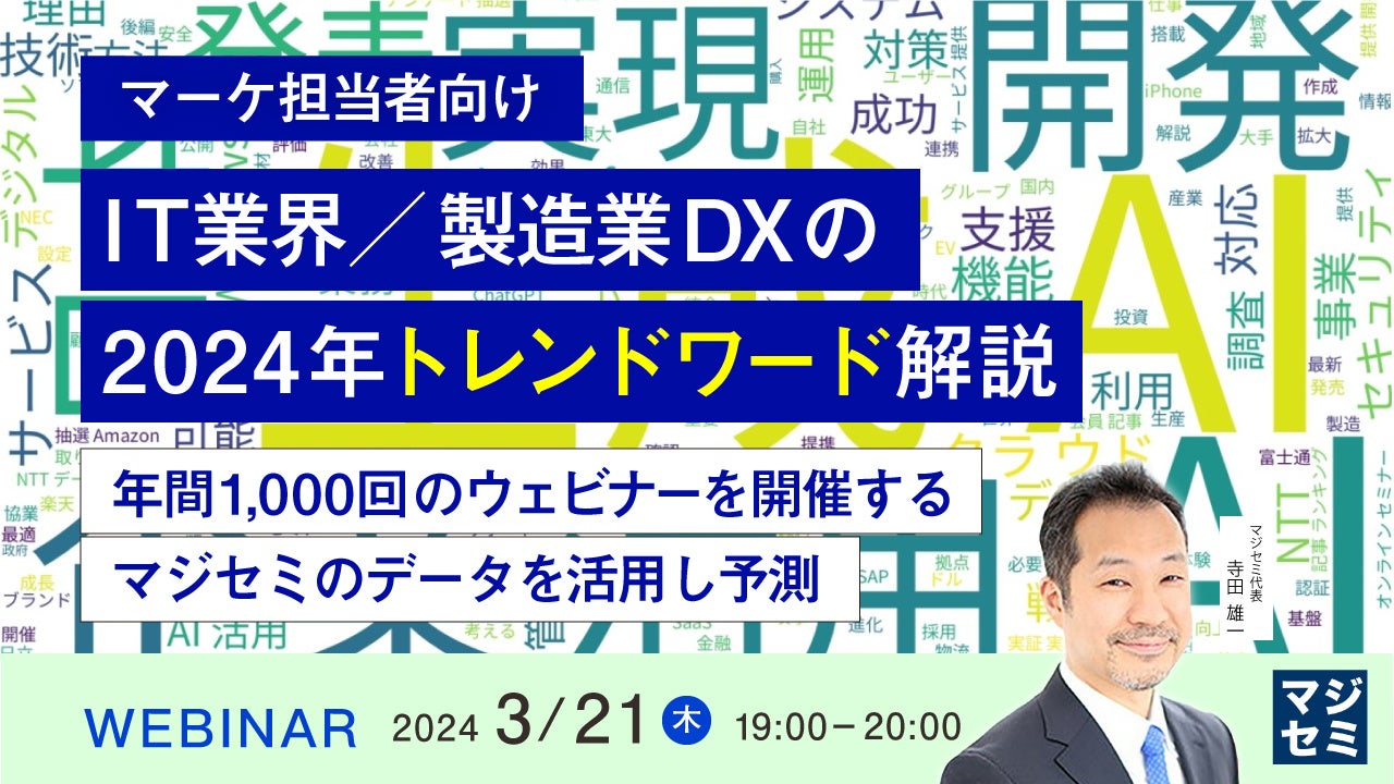年間1,000回のウェビナーを開催するマジセミ代表の寺田が、独断+マジセミのデータを活用して、2024年のIT業界、製造業DXのトレンドワードを予測します。