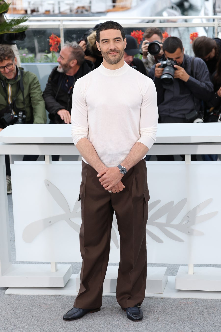 タハール·ラヒムは、オフホワイトのシルクモックネックトップにブラウンのテーラードカーゴパンツを合わせました。
