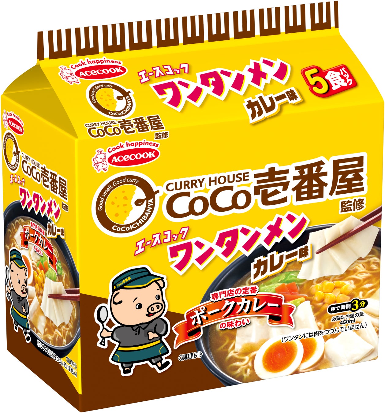 ■パッケージ:ワンタンメンとココイチのコラボレーションが一目で伝わりやすいようにココイチをイメージした黄色と茶色を配色し、ロゴを大きく入れたデザインです。こぶたにはココイチの制服を着用させました。