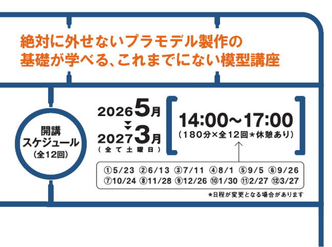 本講座は、「プラモデルを作ってみたいが、何から始めればよいかわからない」、「自己流で作ってきたが、仕上がりに自信が持てない」といった初心者・出戻り世代の悩みに真正面から向き合う、基礎重視・少人数制で全12回の講座です。