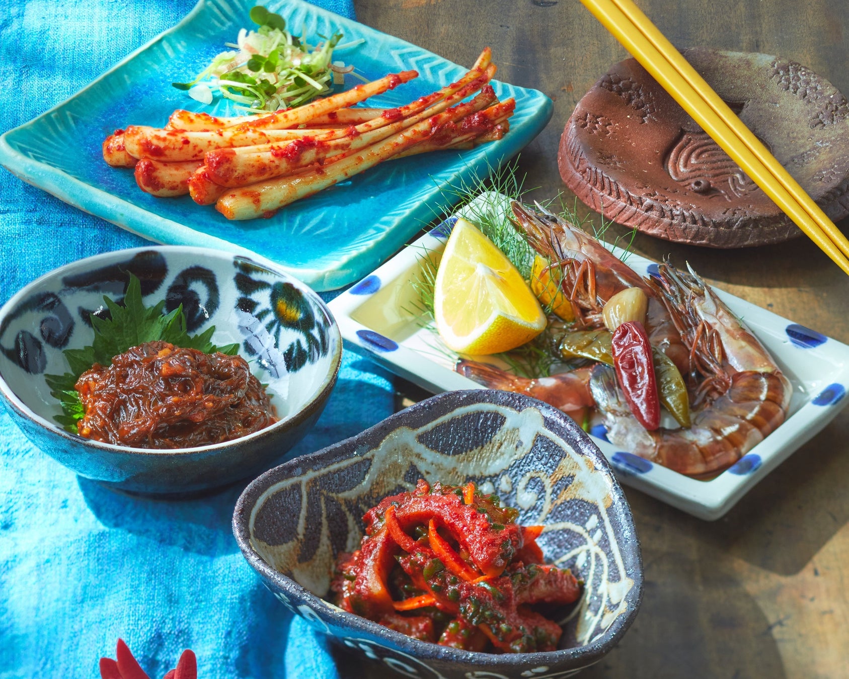 キッチンカーから始まった沖縄発のタコスや、島らっきょうとアグー豚など沖縄素材をたっぷり詰め込んだピザ、塩漬けをしない肉厚な食感の生もずくやゴーヤ、島らっきょうキムチなど珍味も豊富に。