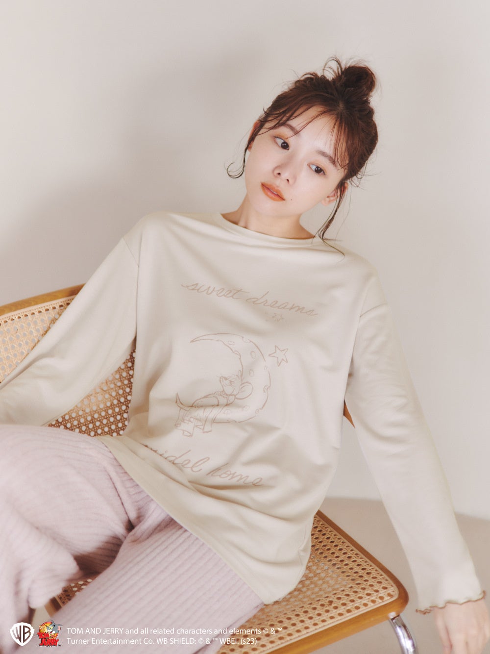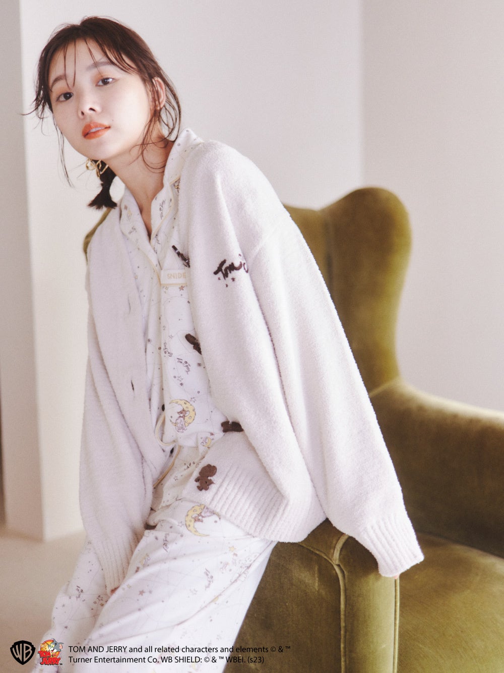 しっとりとなめらかな「Moispro」素材の開襟シャツに、星空の中で眠るトムとジェリーの総柄をプリントで施 しました。生地は裏面を微起毛させているので、肌あたりがより柔らかく春先まで暖かく着ていただけます。抜け感のある襟ぐりのシルエットやパイピング、刺繍入り胸ポケットなど、細部のディテールにもこだわりました。