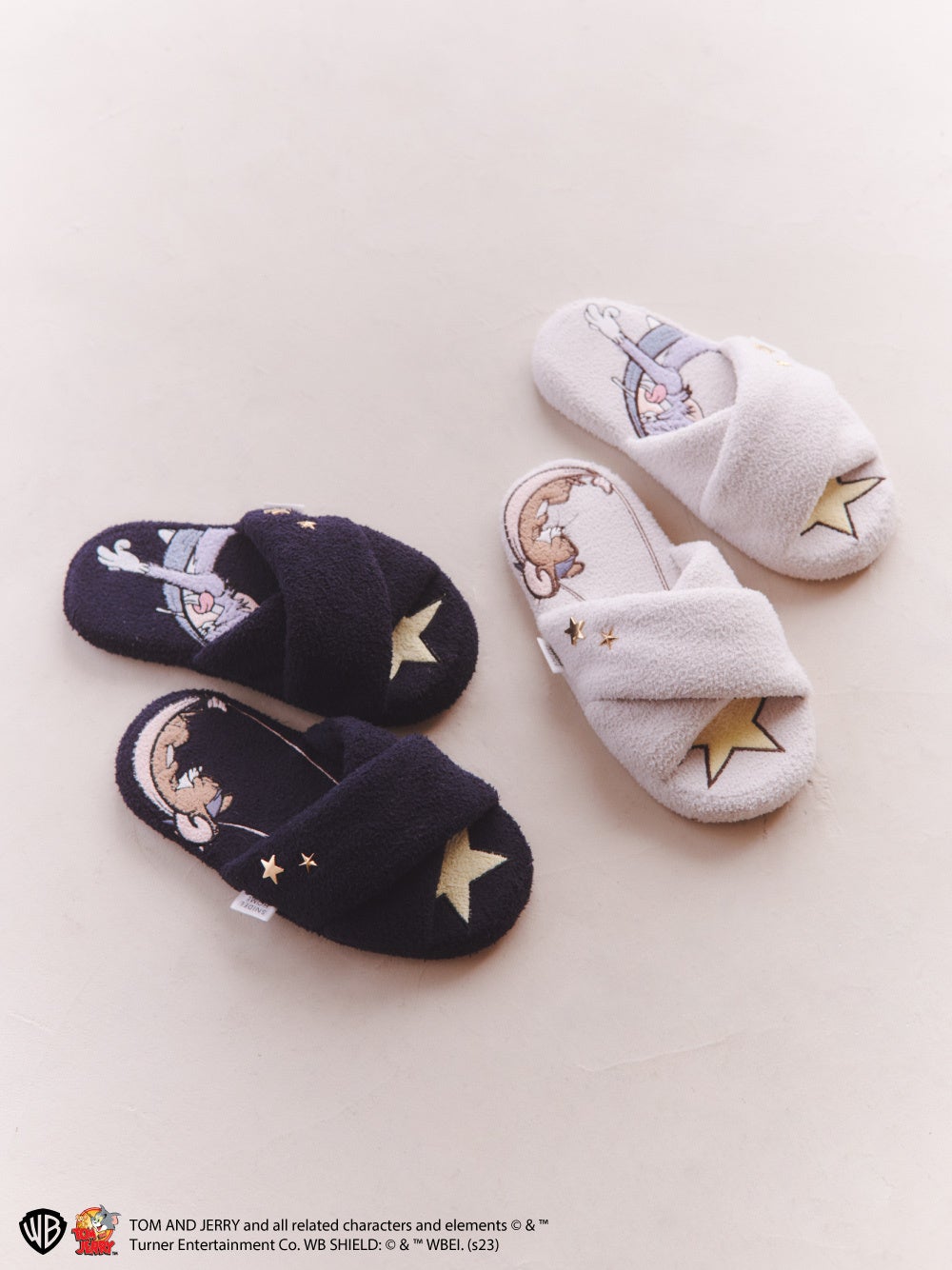 ハンモックで気持ちよさそうに眠るトムとジェリーを左右アシンメトリーにデザインし、ゴールドの星がキラリと輝くふわふわニットのスリッパです。ジャガードと刺繍で大胆に表現した絵柄は、「SNIDEL HOME」だけのオリジナルデザイン。つま先が開いたクロスデザインなのでムレにくく、これから春にかけての季節にぴったりです。