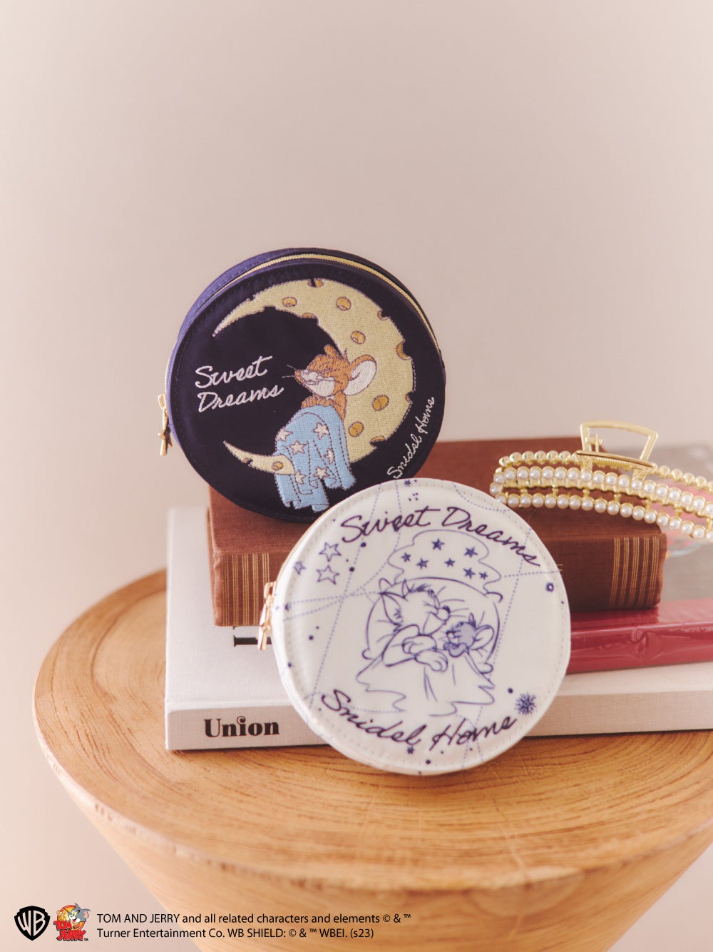 サークル型の可愛らしいポーチに、それぞれ異なるイラストをデザインしました。ホワイトには仲良く眠るトムとジェリーを落ち着いた印象の線画でプリント、ネイビーはチーズの月で夢見るジェリーをポップに刺繍しています。しっかり入るマチありタイプなので、普段使いのメイクポーチなどにぴったりです。