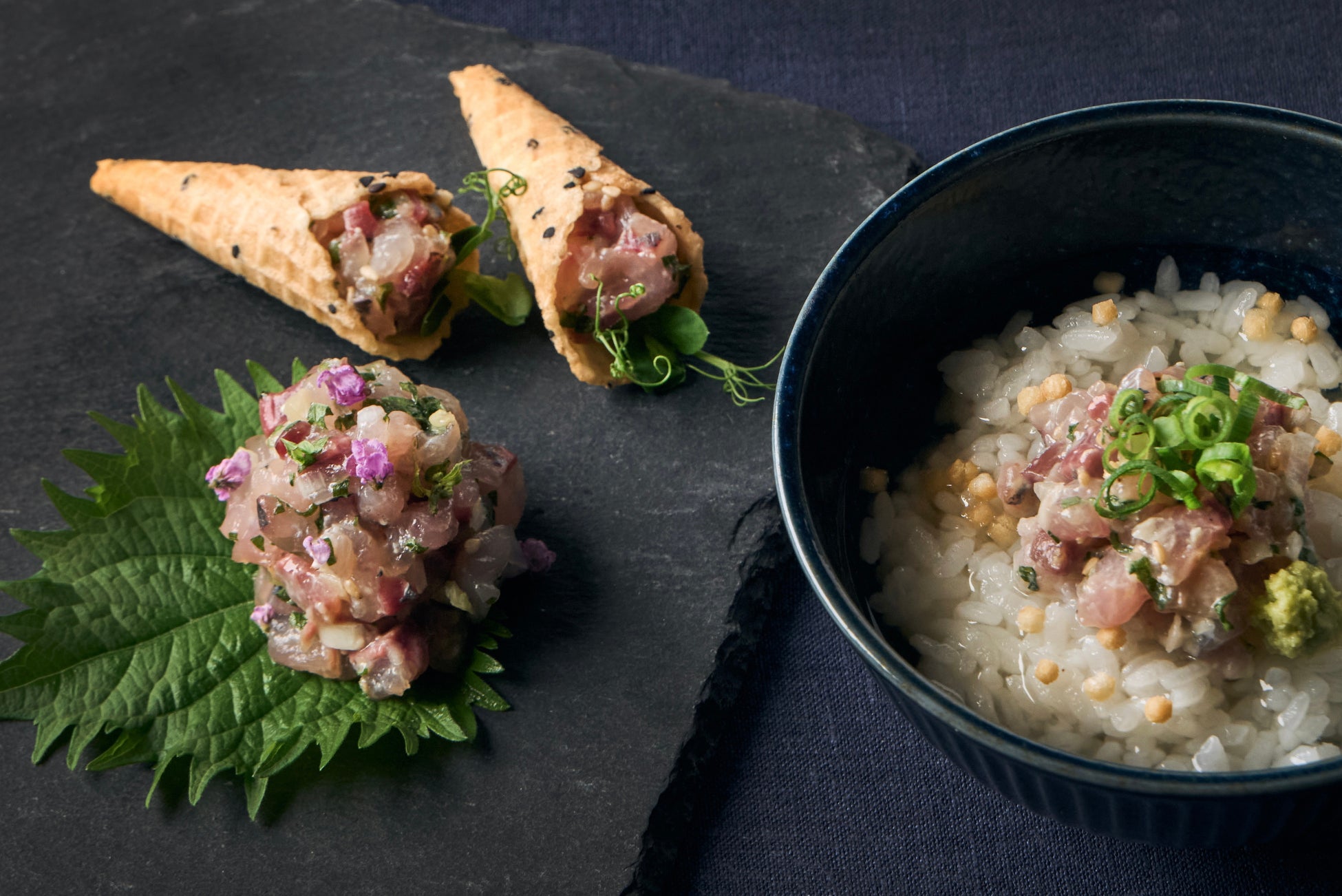 レストランには、海の幸をテーマにした多彩な料理が並びます。なめろうは、出汁をかけたお茶漬け風や、ゴマ風味のコーンに盛り付けた前菜仕立ての一品など、リゾナーレ熱海ならではのアレンジで提供。また、ライブキッチンでは、海老や帆立を目の前で豪快に焼き上げる「海鮮プランチャ」や鰺フライをスタッフが目の前で仕上げます。香りや音、できたての味わいを五感で楽しめる、臨場感あふれる食体験です。