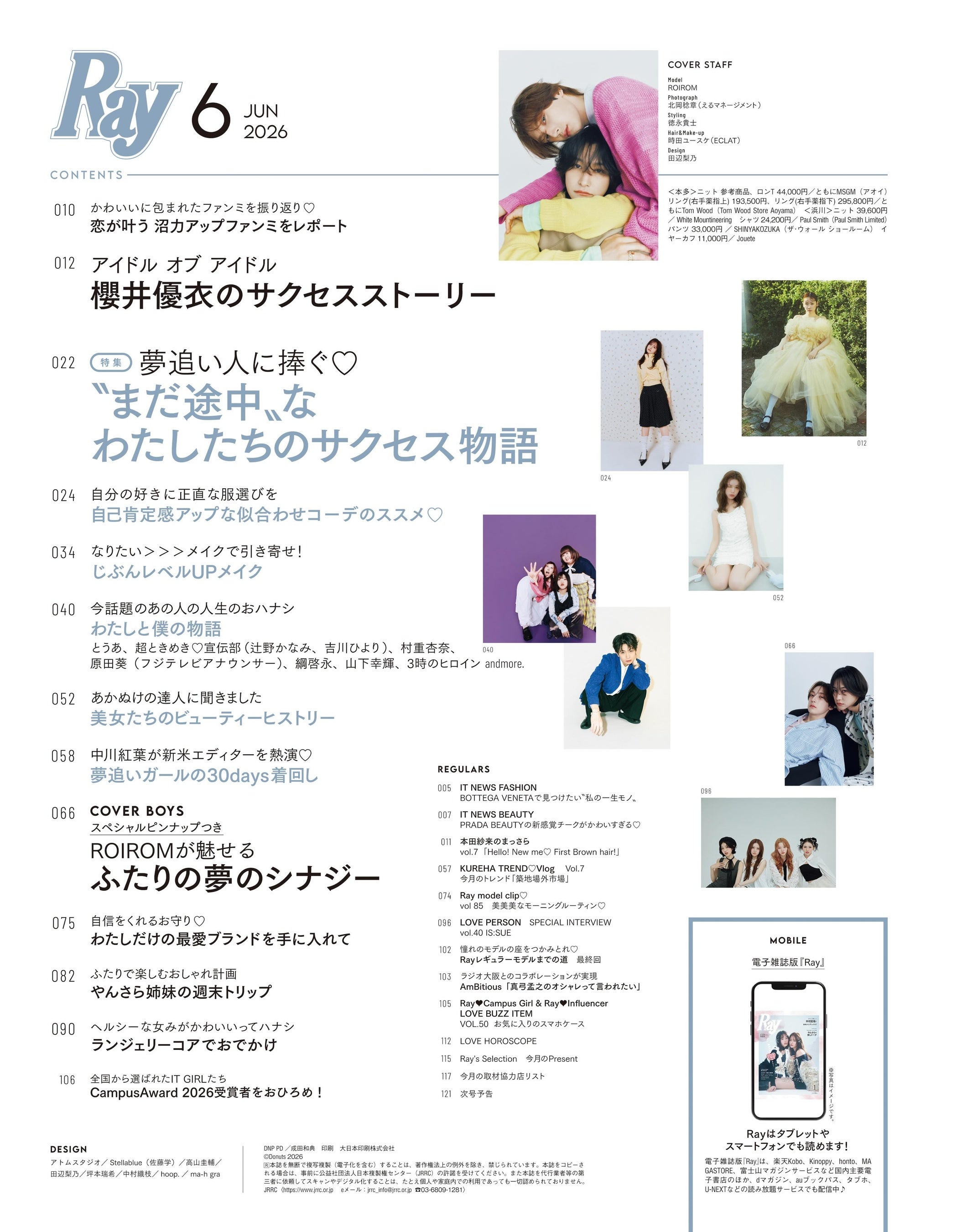 2026年4月23日(木)に発売する2026年6月号の通常版表紙は櫻井優衣(FRUITS ZIPPER)、特別版表紙はROIROMがそれぞれ務めます。今号の大特集テーマは「“まだ途中”なわたしたちのサクセス物語」。夢や憧れを持つ全ての人に向けて、なりたい自分になるためのヒントをぎゅっと詰め込んだ一冊です。いま話題の方々が明かしてくれる成功の秘訣や、いまからでも真似できるファッションやヘアメイクなどのポイントもご紹介しています。