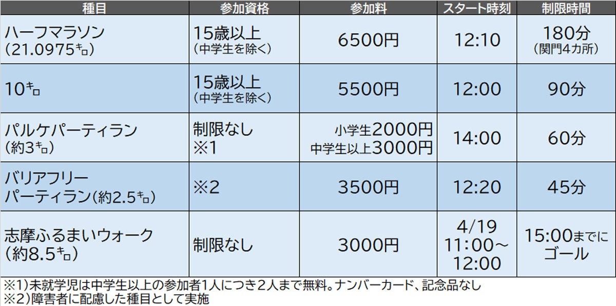 このほかスタート・フィニッシュ会場の志摩スペイン村バス駐車場では、豊富な海の幸をはじめとした地元の食が気軽に楽しめる「ごちそう屋台 伊勢志摩物産市」も開催。大会当日と前日は、参加ランナーであればナンバーカード(ゼッケン)提示で志摩スペイン村に入園でき、同伴者も3人までパスポートか2DAYパスポートが半額になります。