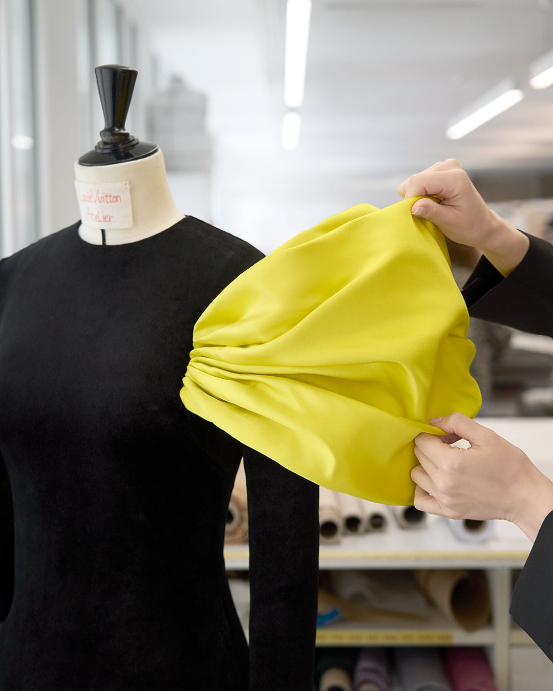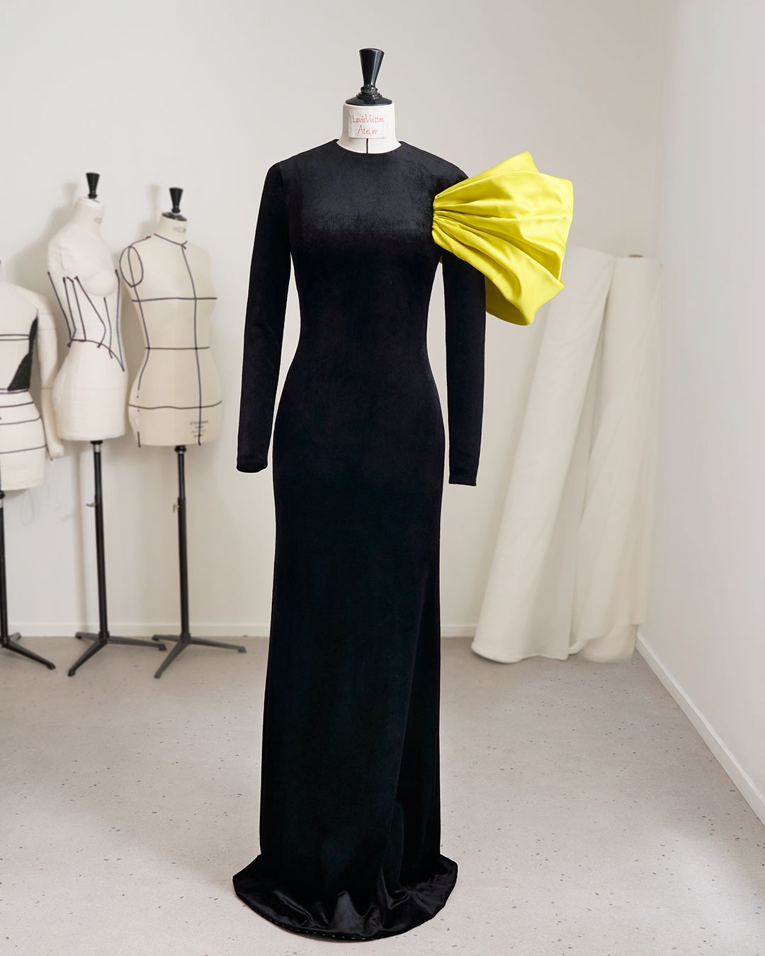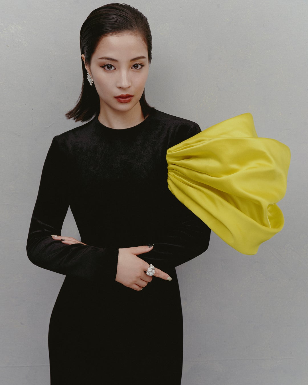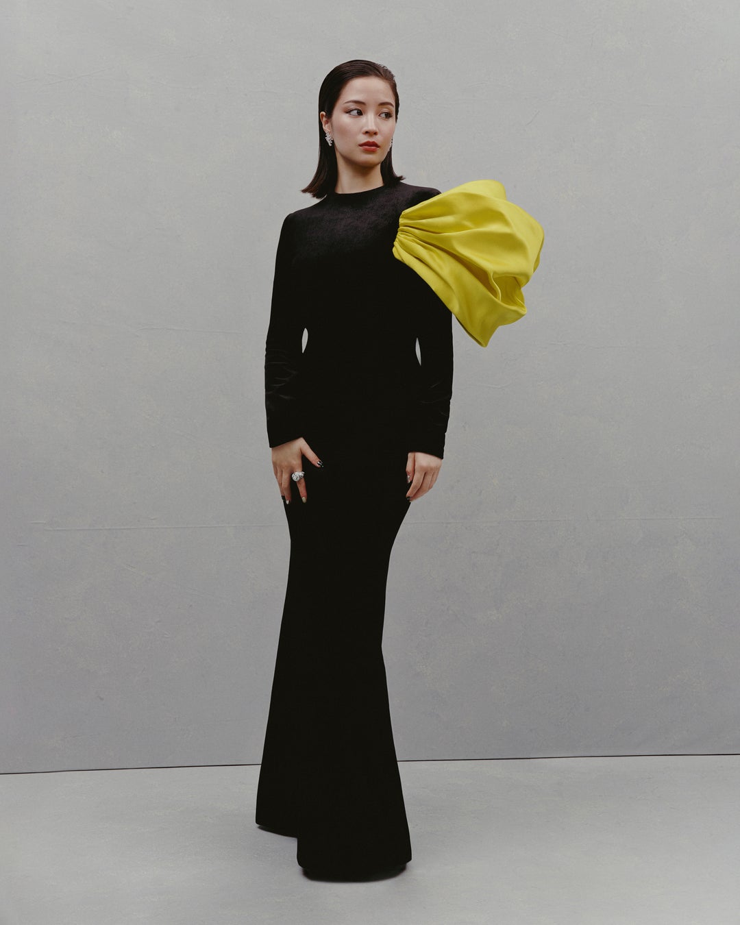 広瀬すずが着用したロングスリーブドレスは、ブラックのベルベットに、華やかなイエローシルクカラーの構築的なドレープスリーブがあしらわれています。