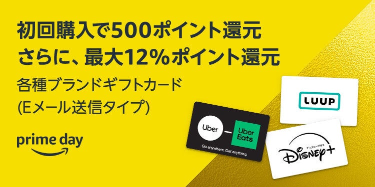 各種ブランドギフトカード(Eメール送信タイプ)の初回購入でAmazonポイントを500ポイント還元キャンペーン期間中にプライム会員のお客様が、キャンペーンにエントリー後、Eメール送信タイプの各種ブランドギフトカードを合計10,000円以上購入すると、500ポイント(期間限定ポイント)を還元します。さらに、ポイントアップキャンペーンに参加すると最大12%ポイント還元されます。