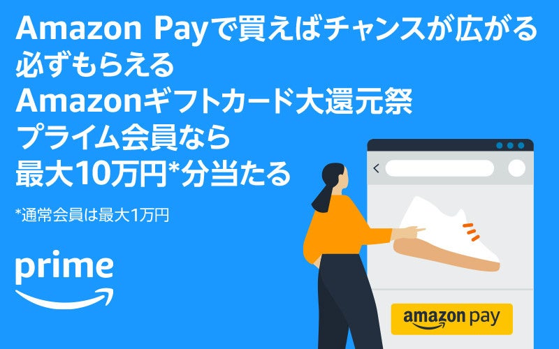 Amazon Payを使ったECサイトでのお買い物でプライム会員には最大10万円相当のAmazonギフトカードを抽選でプレゼント