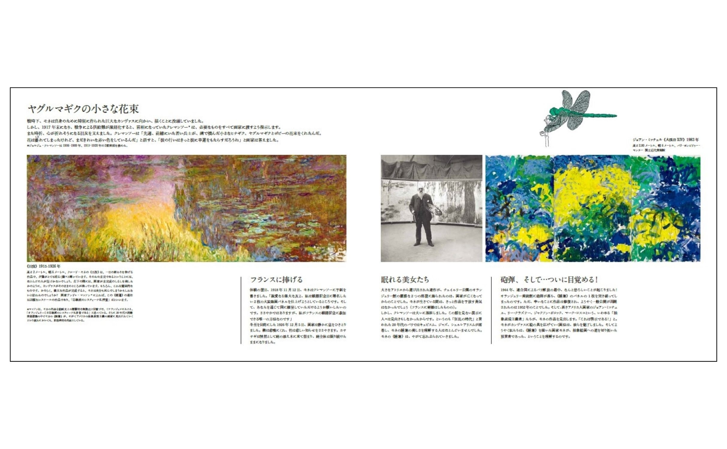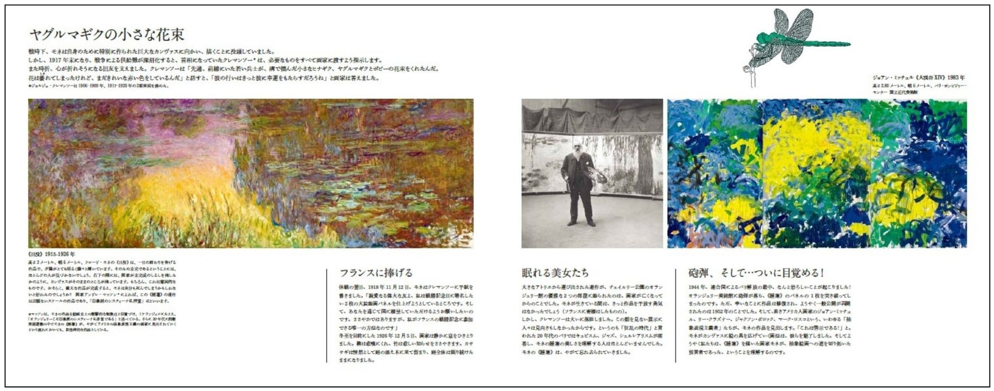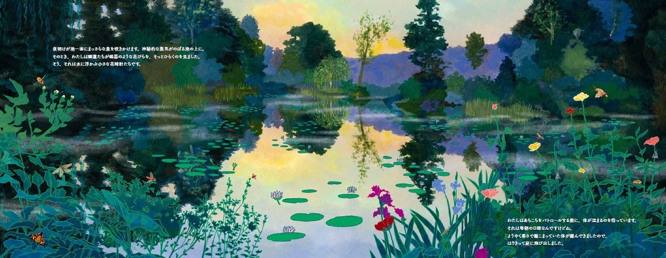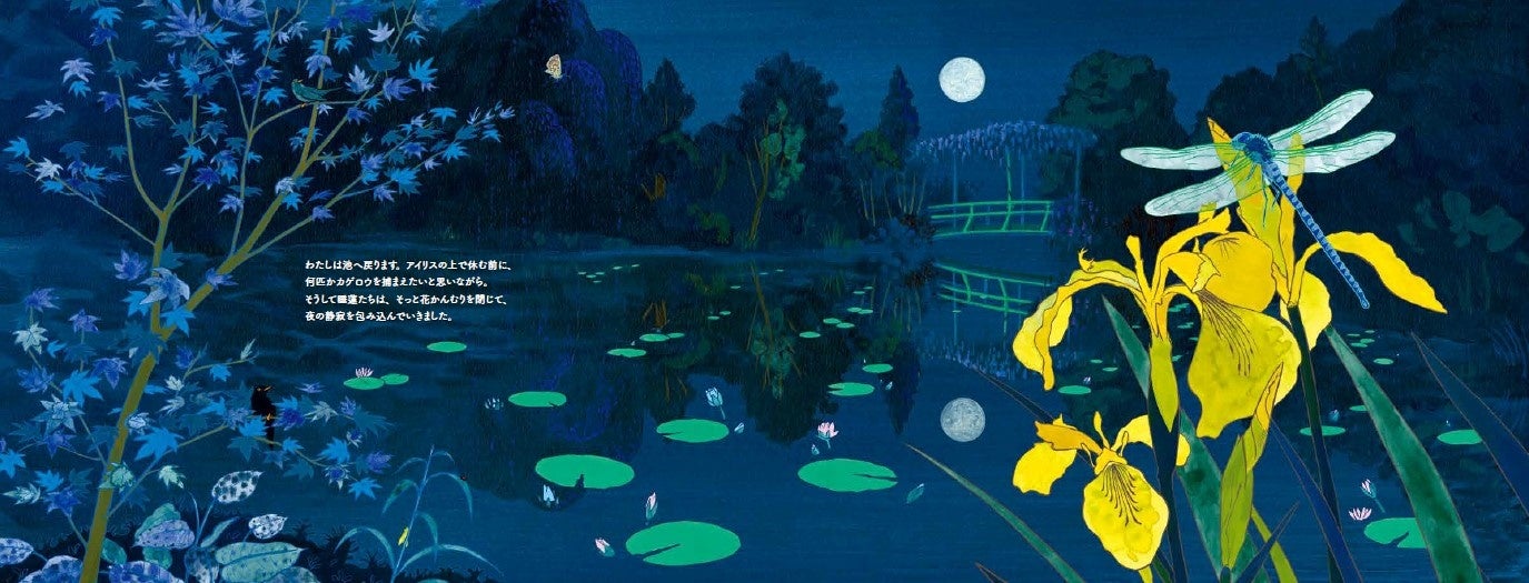 日本のアニメの世界とモネの幽玄たる美術が融合したような世界観。モネが愛した庭の花々はもちろん、そこに集う鳥や昆虫、池に住む鯉やカエルなど、ジヴェルニーの庭の息遣いさえ感じられます。
