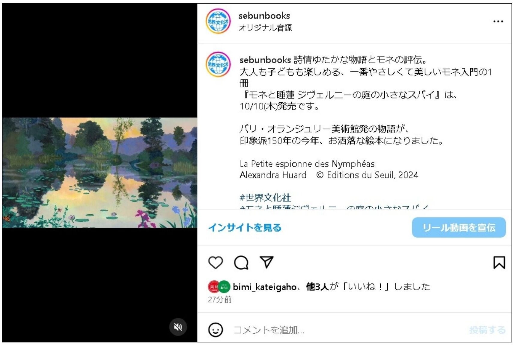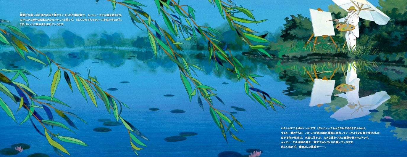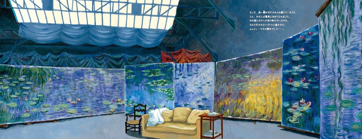 本書はモネの睡蓮の大作で知られるパリ・オランジュリー美術館発。青少年向けに物語仕立てにしたPodcast(音声解説)からスピンアウト。1年をかけて作画され、印象派誕生150周年の2024年春に刊行された美装の大型絵本です。