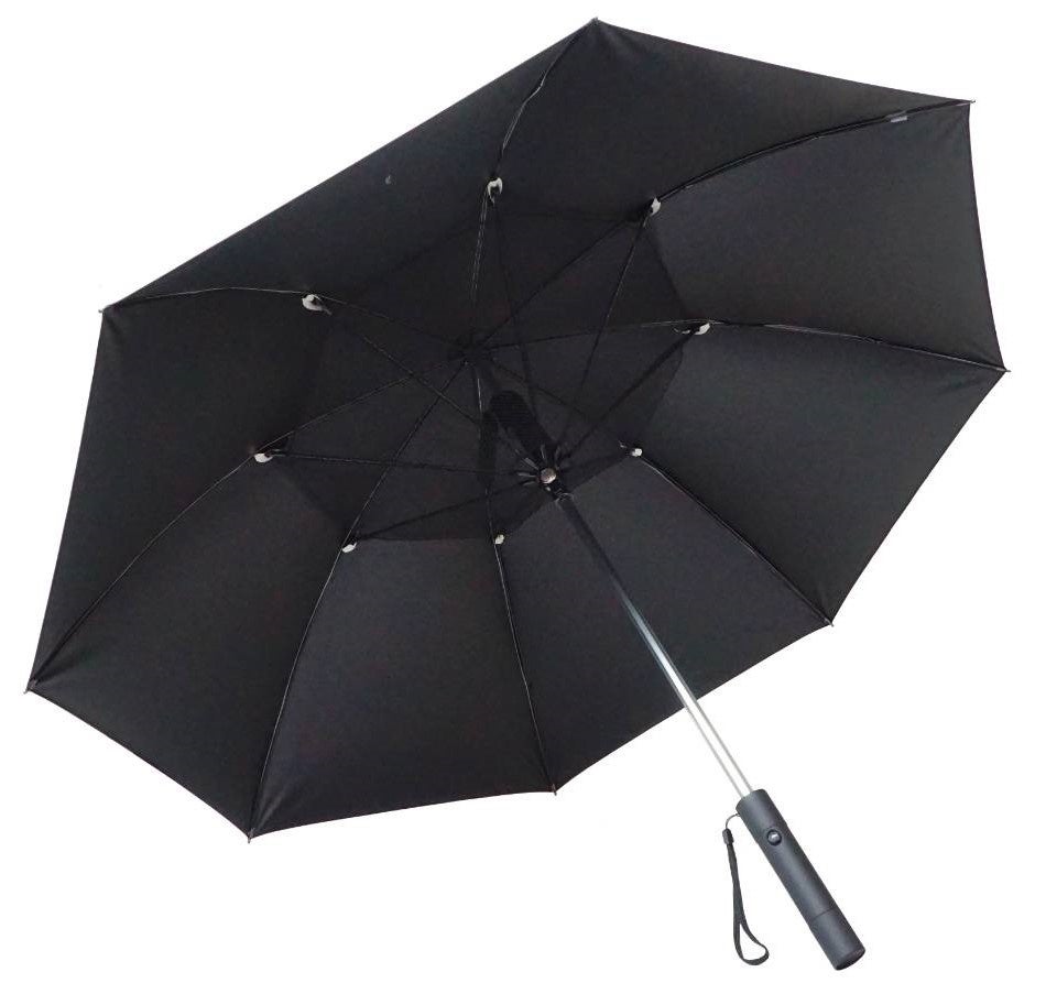 日傘に扇風機ファンを内蔵した晴雨兼用傘です。プロペラ部分はネット付きで、髪や衣類の巻き込みを防止します。