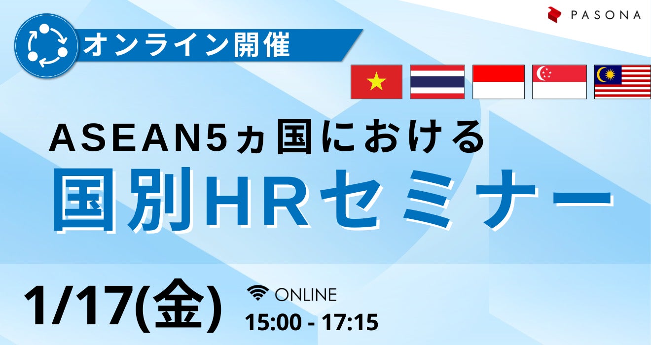 株式会社パソナは海外人事責任者および実務担当の皆様を対象に、『ASEAN5ヵ国における国別HRセミナー』を2025年1月17日(金)に開催いたします。