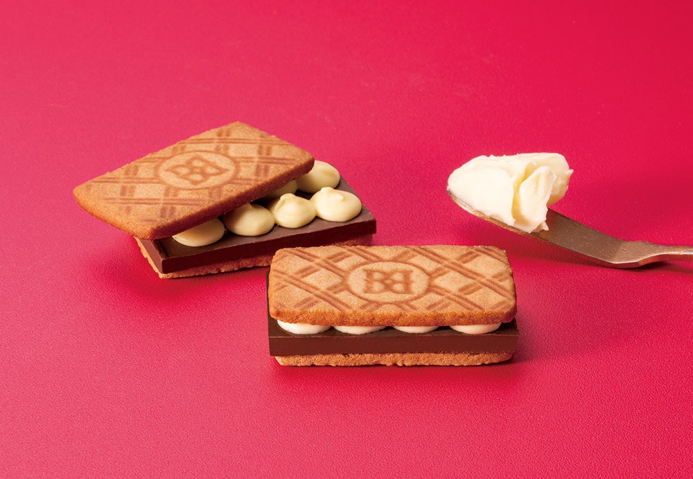 ふっくらしぼったバターホイップショコラに、アーモンドペーストを練り込んだ厚切りプラリネショコラ。バレンタインシーズンにふさわしく、サクサクのバターサブレでボリュームいっぱいにサンドしました。バタースイーツ専門店ならではの発想で生まれた、とろけあうバターとショコラを楽しむ魅惑のサンドです。