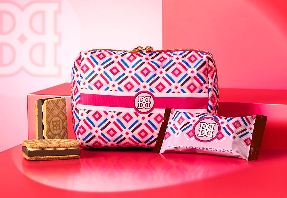 『バターホイップショコラサンド』のパッケージとお揃いの、総柄ポーチが今年も登場します!ダブルジップファスナーでガバッと開きやすく、内側にはポケット付き。細かく小物を分けて入れられるのが嬉しいポイントです。ギフトはもちろん、自分用にもおすすめ。