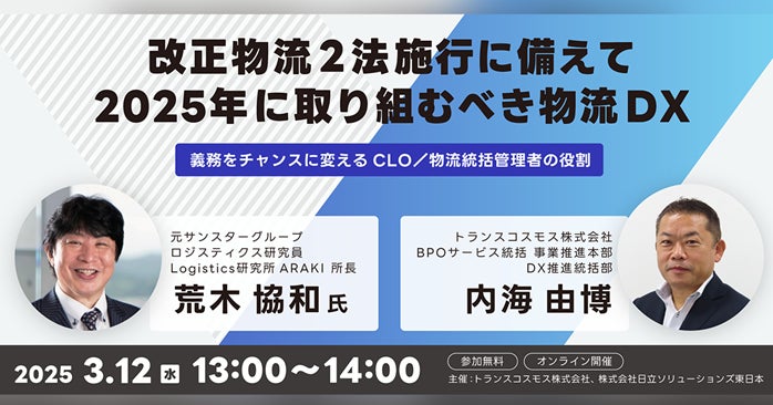 トランスコスモスは、オンラインセミナー改正物流2法施行に備えて2025年に取り組むべき物流DX~義務をチャンスに変えるCLO/物流統括管理者の役割~を3/12(水)に開催します。