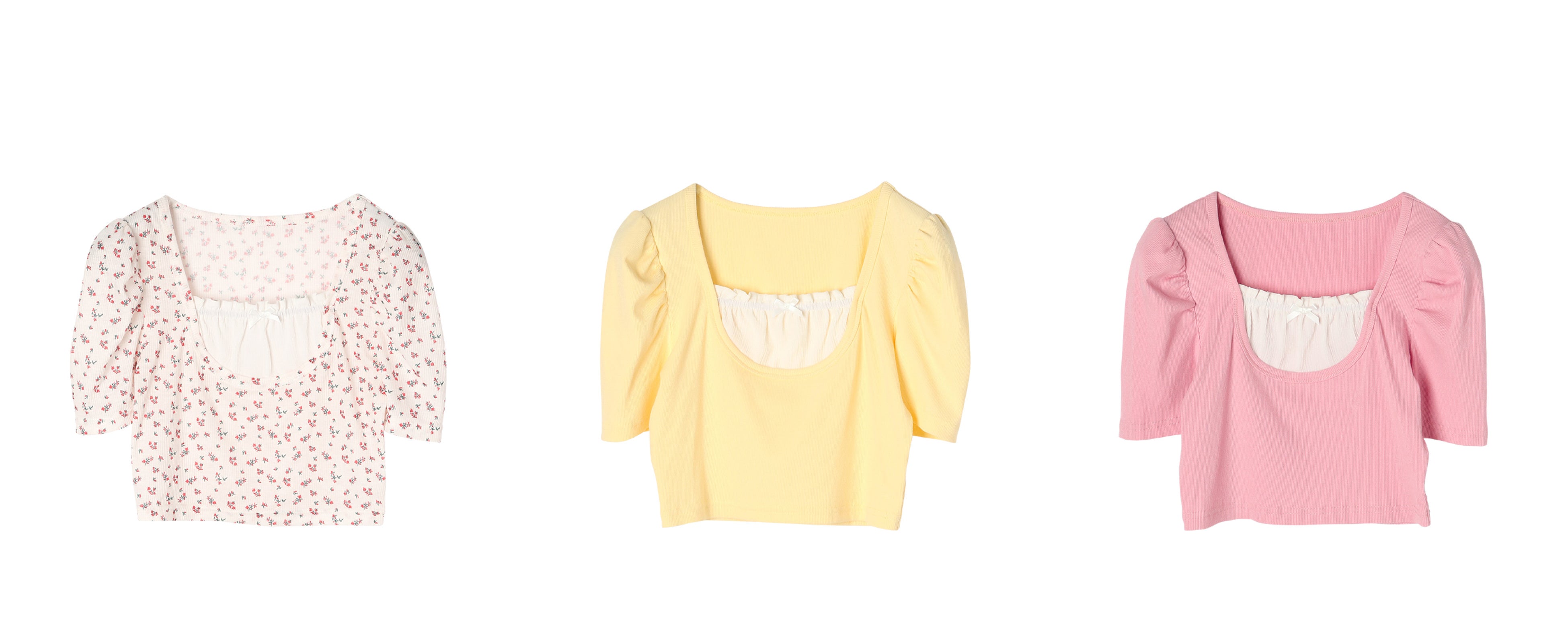 1枚で韓国っぽいコーデが叶うデザイントップス!フロント部分のギャザーとプチリボンが写真映えも間違いなし。