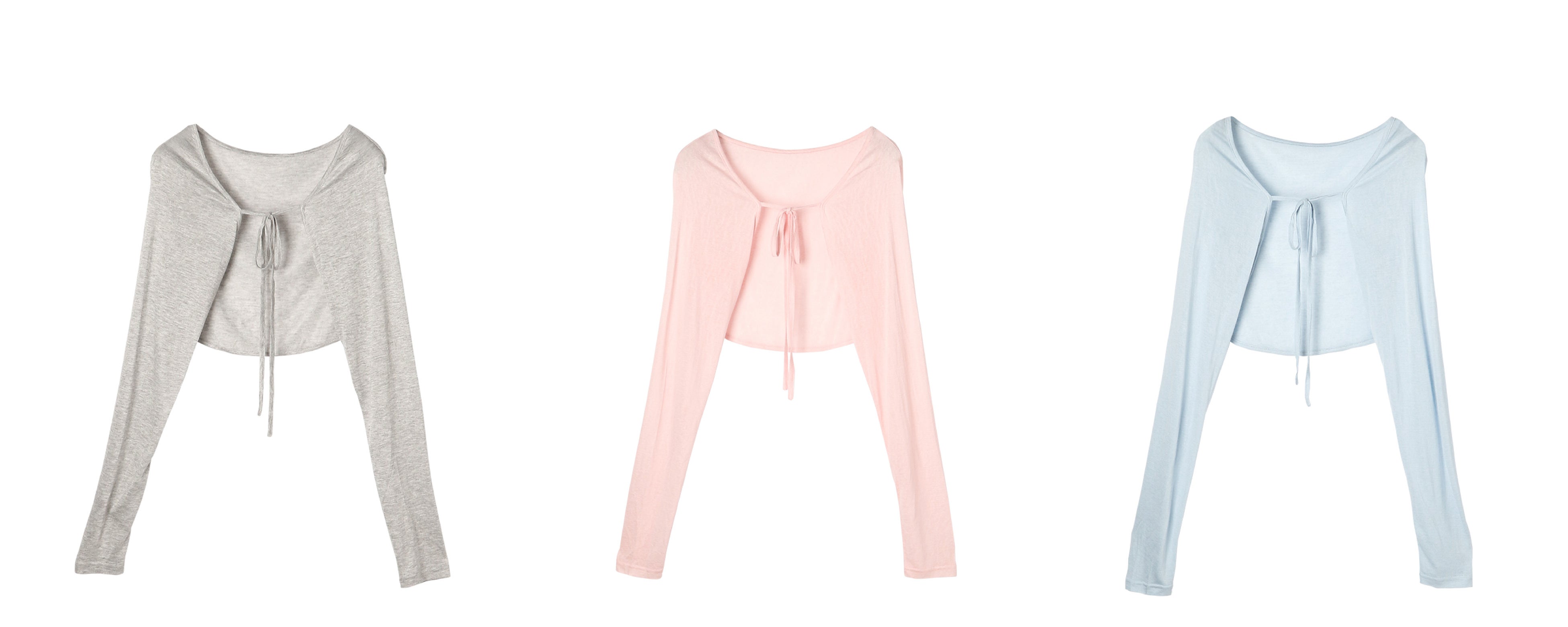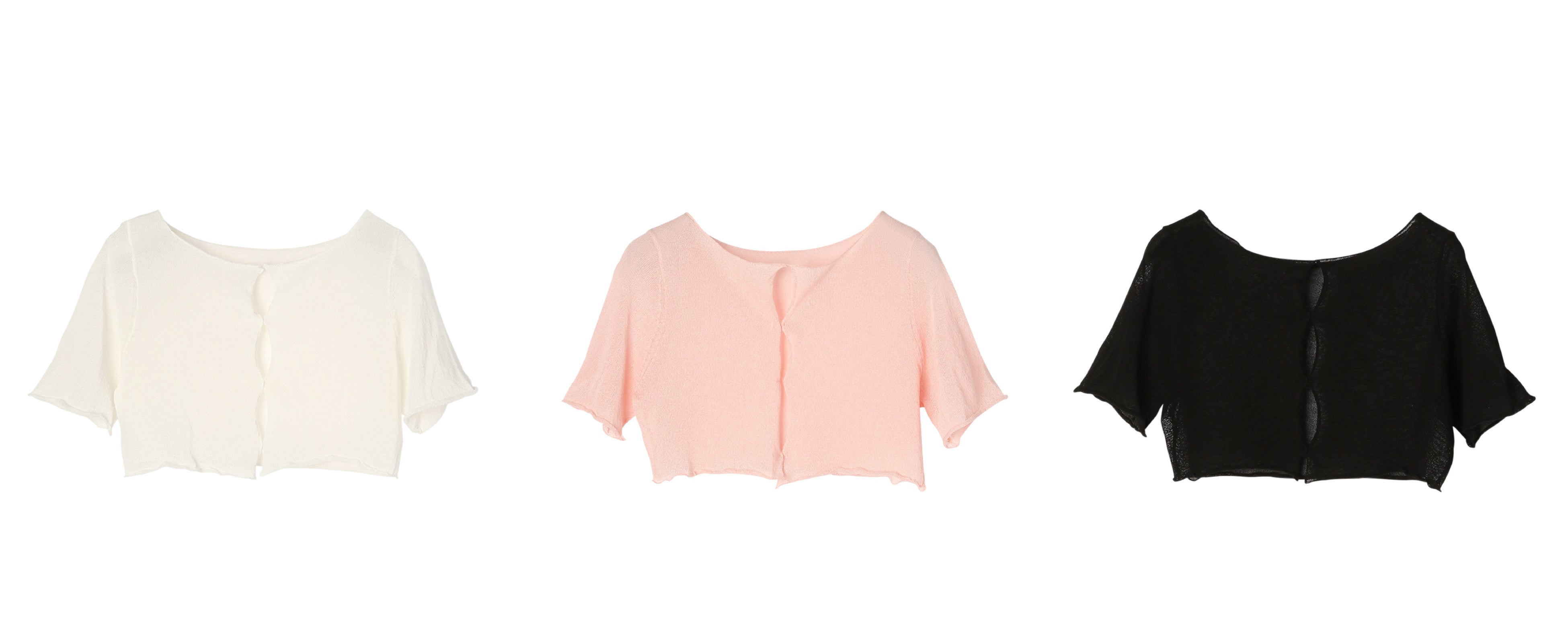1枚持っていると万能に使えるボレロ。リボンを長めにしているので、少し緩めに結んでオフショルっぽく。