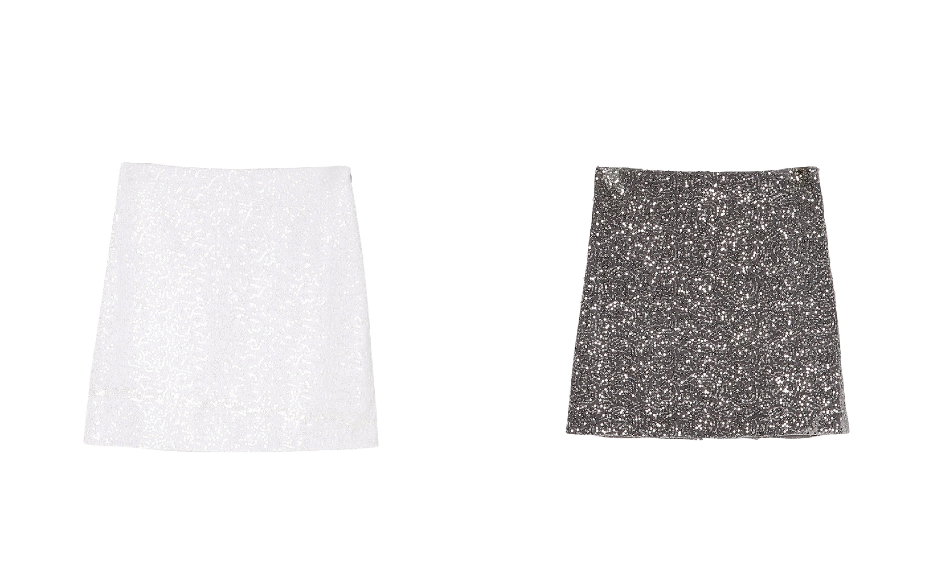 着るだけで華やかになるスパンコールスカート。スパンコールを生地と同色にしているので、さりげないキラキラ感。