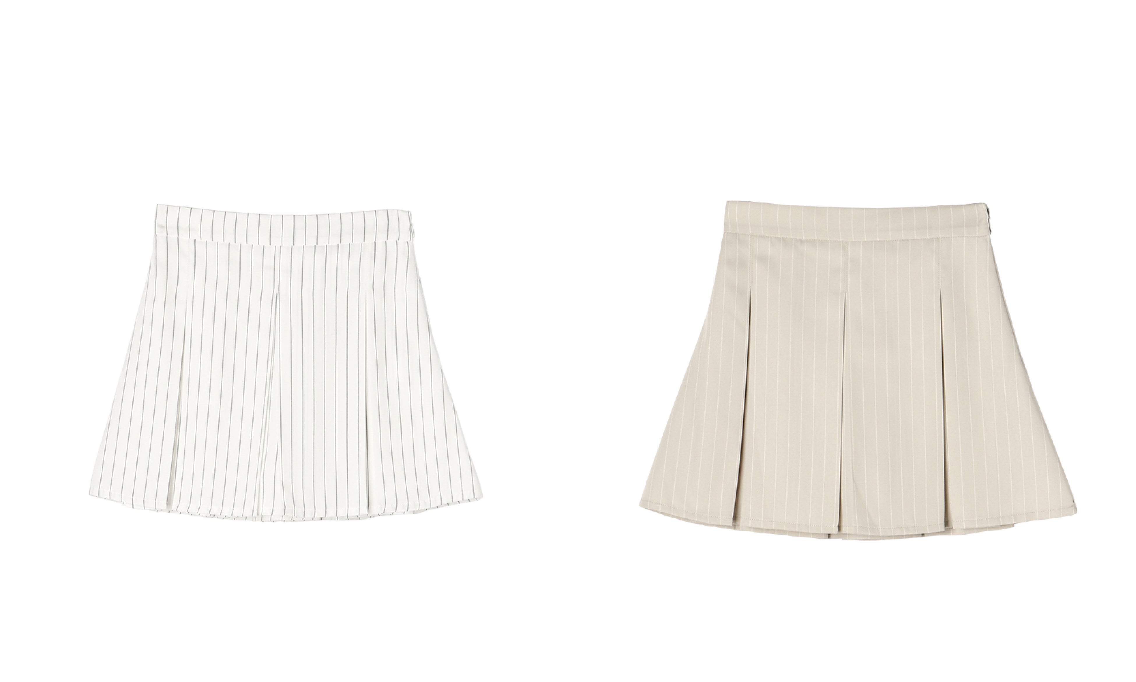 韓国っぽコーデにはマストなプリーツスカートにトレンドの細ストライプ柄。