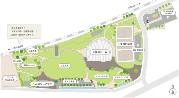 本公園は、2014年から岡山市による整備が始まり、現在、岡山ドームや多目的広場などがある総合運動公園です。「人々が関わることで育まれる都市の森」をコンセプトに、緑ゆたかな魅力あふれる公園を目指しています。
