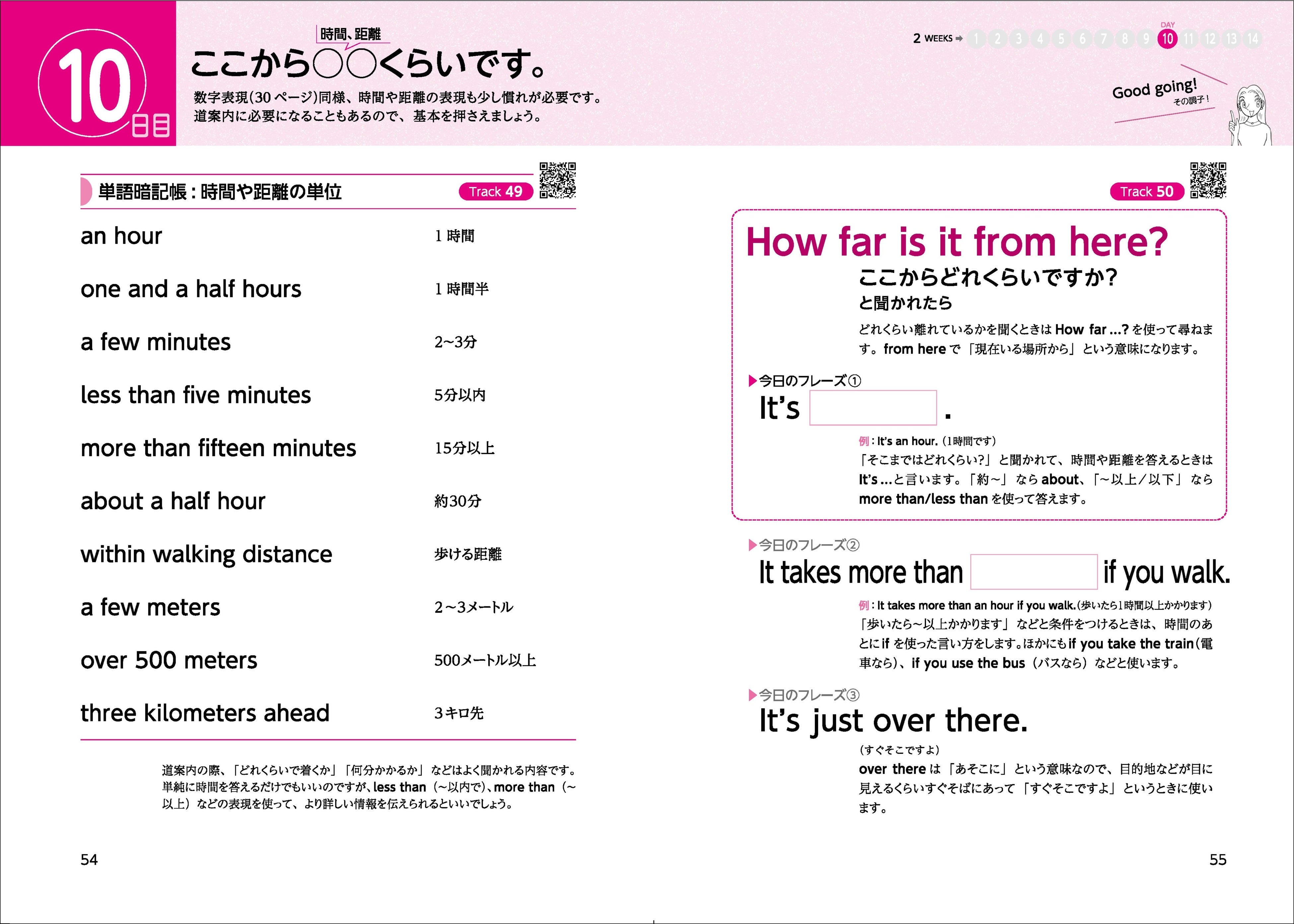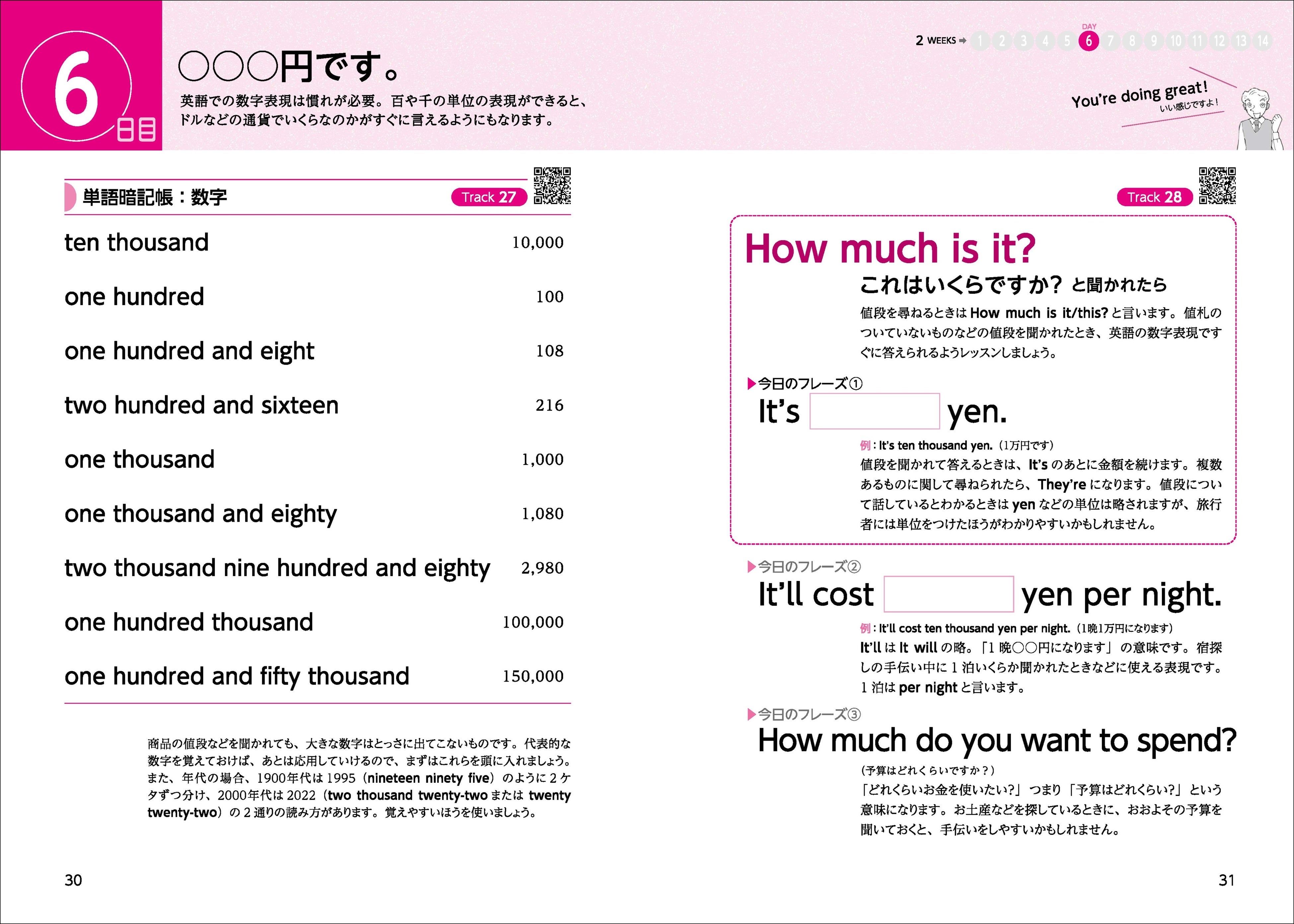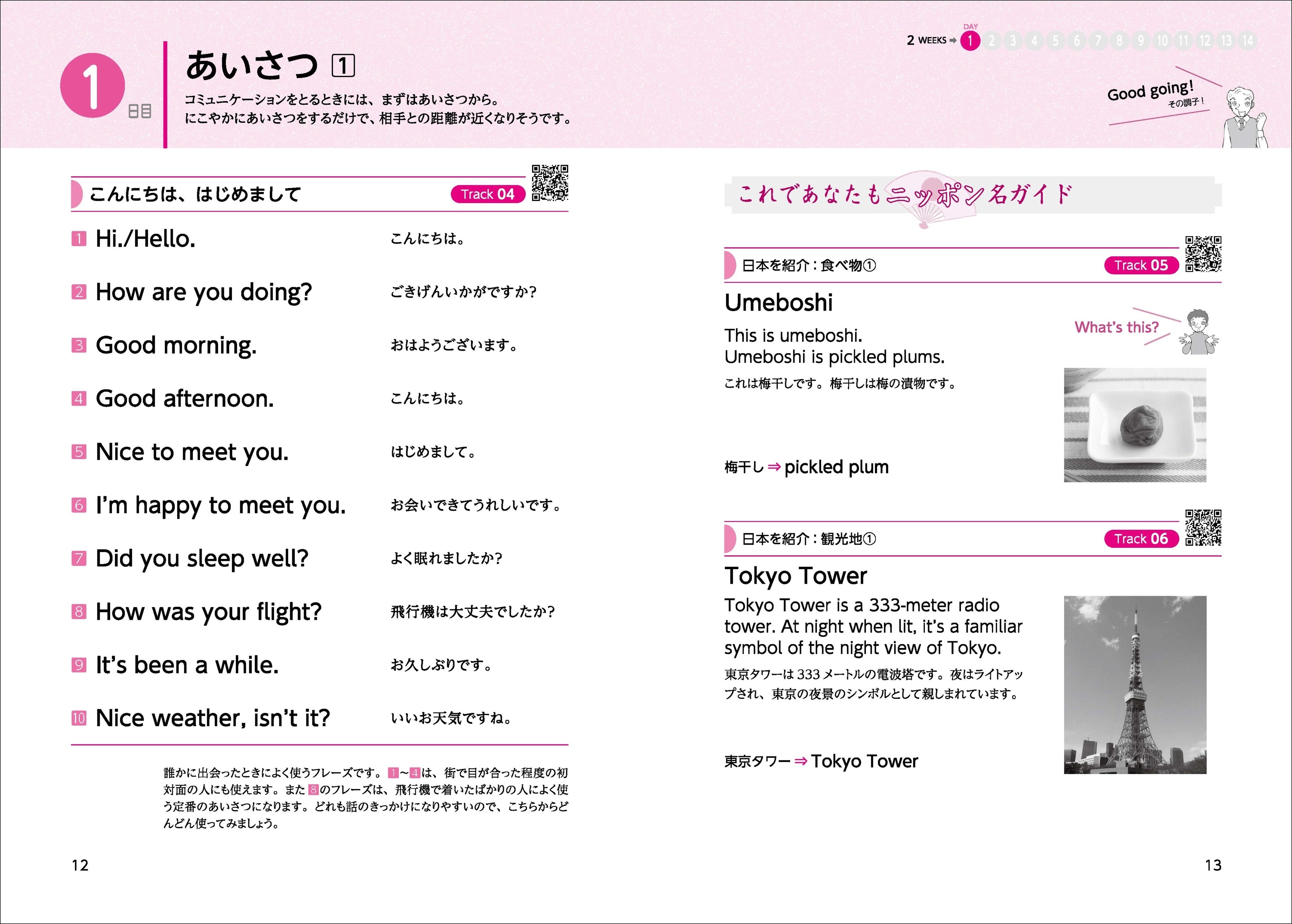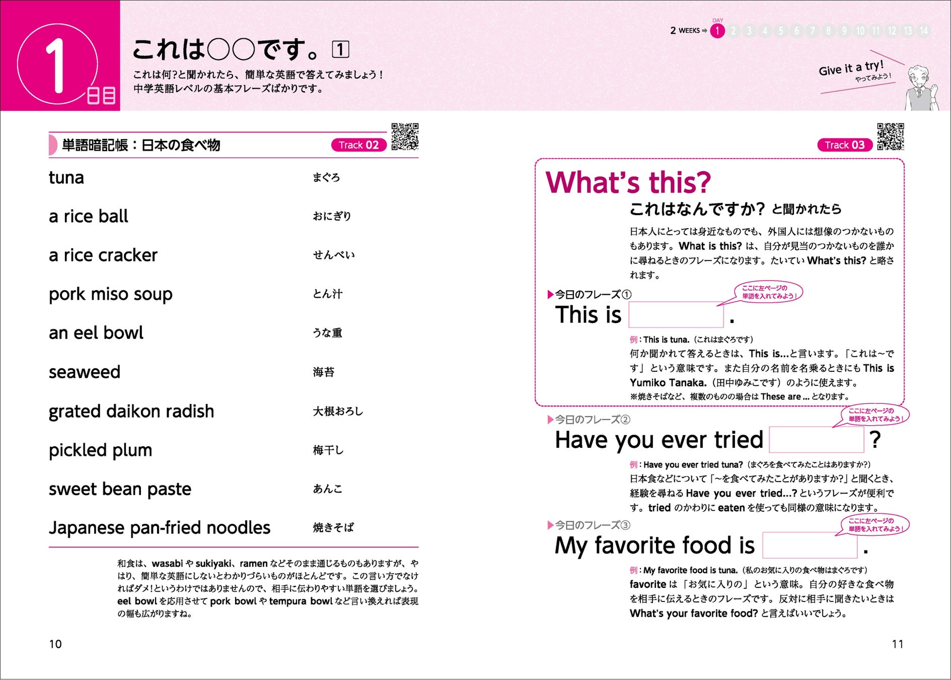 毎レッスンの音声は誌面のQRコードからアクセスでき、スマホからも聞ける仕様。日本語のあとにネイティブ英語が続くので、久しぶりにリスニングする人でもすんなり耳に入ります。