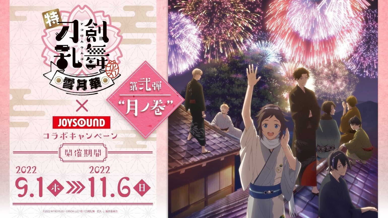 株式会社エクシングの子会社で、全国にカラオケ店舗を展開する株式会社スタンダード(本社:東京都港区、代表取締役社長:米田洋一)は、2022年9月1日(木)から2022年11月6日(日)までの期間中、「特『刀剣乱舞-花丸-』〜雪月華〜」×JOYSOUND直営店コラボキャンペーン第弐弾と題して、JOYSOUND仙台一番町店(宮城)・JOYSOUND名駅二丁目店(愛知)・JOYSOUNDなんば戎橋店(大阪)・JOYSOUND博多口駅前店(福岡)にカラオケコラボルームをオープンいたします。また、コラボルーム実施店舗を含む、全国のJOYSOUND直営店25店舗にて、「特『刀剣乱舞-花丸-』〜雪月華〜」オリジナルコースター付きコラボドリンクメニューを展開します。
