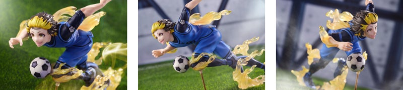 強化指定選手の1人“蜂楽 廻(ばちら めぐる)”を、彼が得意とするドリブルで駆けるポーズでフィギュア化。ゴールへ向かう躍動感と豊かな表情は、エネルギッシュかつ繊細な造形で表現。スピード感あふれる姿を表現するため、本体周りに透明パーツで風のエフェクトを施しました。